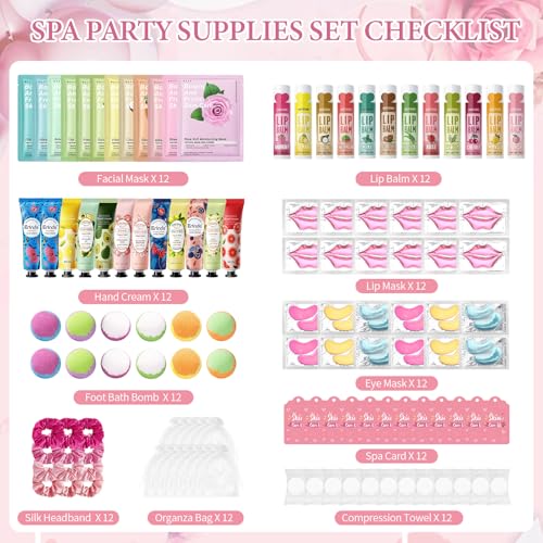 - ¡¼Complete Spa Party Supplies for Girls¡½This all-in-one spa party kit includes 12 sets of face masks skincare, under eye patches, hand creams, lip balms, lip masks, bath bombs, compressed towels, silk headbands, and organza gift bags, plus a skincare guide card. Perfect for spa birthday party supplies for girls, sleepovers, and girls spa party supplies, everything you need to pamper 12 guests