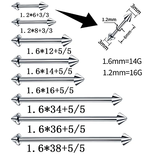 - Jewelry Includes: 4 pcs belly button ring(14g); 2 pcs smile vampire lip ring(16g); 3 pcs C shaped nose ring(20G); 3 pcs circle titanium nose ring(20G); 9 pcs nose screw studs(20G, S/L/pin shape); 12 pcs curved barbell ball spike(16g); 16 pcs straight barbells jewelry with cone(16g); 12 pcs industrial barbell(16g); 4 pcs labret stud spike(16g); 4 pcs labret barbell(16g); 4 pcs horseshoe nose ring(16g); 4 pcs captive bead ring(16g); 4 pcs spike horseshoe ring(16g); 4 pcs spiral barbell(16g)