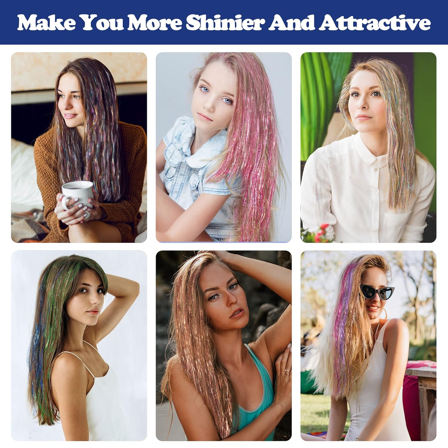 - 【Suitable for many occasions】Our Glitter Hair Extensions can also be used for music festivals, cosplay, weddings, parties, Halloween and Christmas. Also, the hair tensile can also decorate your hats, bags, balloons, gift wrap and more.