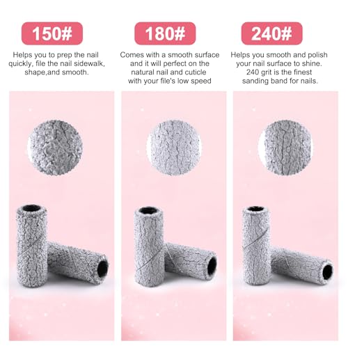 - [Various Grit Options] 150 grit small sanding bands help you to prep the nail quickly, file the nail sidewalk, shape, and smooth. 180 grit mini sanding bands are perfect for the natural nail and cuticle with low rotation speed. 240 grit small sanding bands for nail drill bits help you smooth and polish your nail surface to shine.