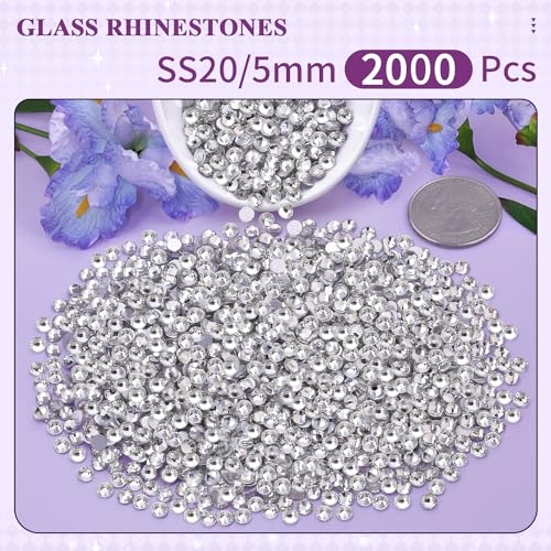 2000PCS SS20/5mm Glass Crystal Rhinestones (Clear), Flatback Clear Rhinestones for Bedazzling Crafting DIY Crafts Nail Art Makeup Decoration, Gems Diamond Charms for Tumbler Shoes Clothing Mug