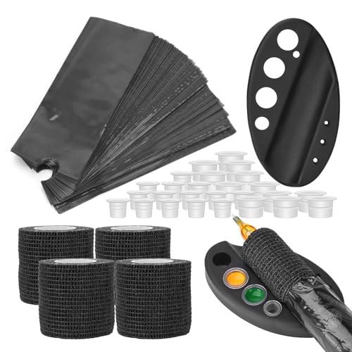 - ¡¼Package and Size¡½Comes with 200pcs tattoo pen covers, 4pcs tattoo grip wrap and 1pc tattoo pen holder. Tattoo machine covers measures 4.7x1.8 inches(12x4.5cm), each roll of tattoo grip tape measures 2" x 5 yards/5cm x 4.5m and the size of tattoo pen holder is 4.3x2.4 inches(10.9x6cm). It is economical and convient set for tattooing.