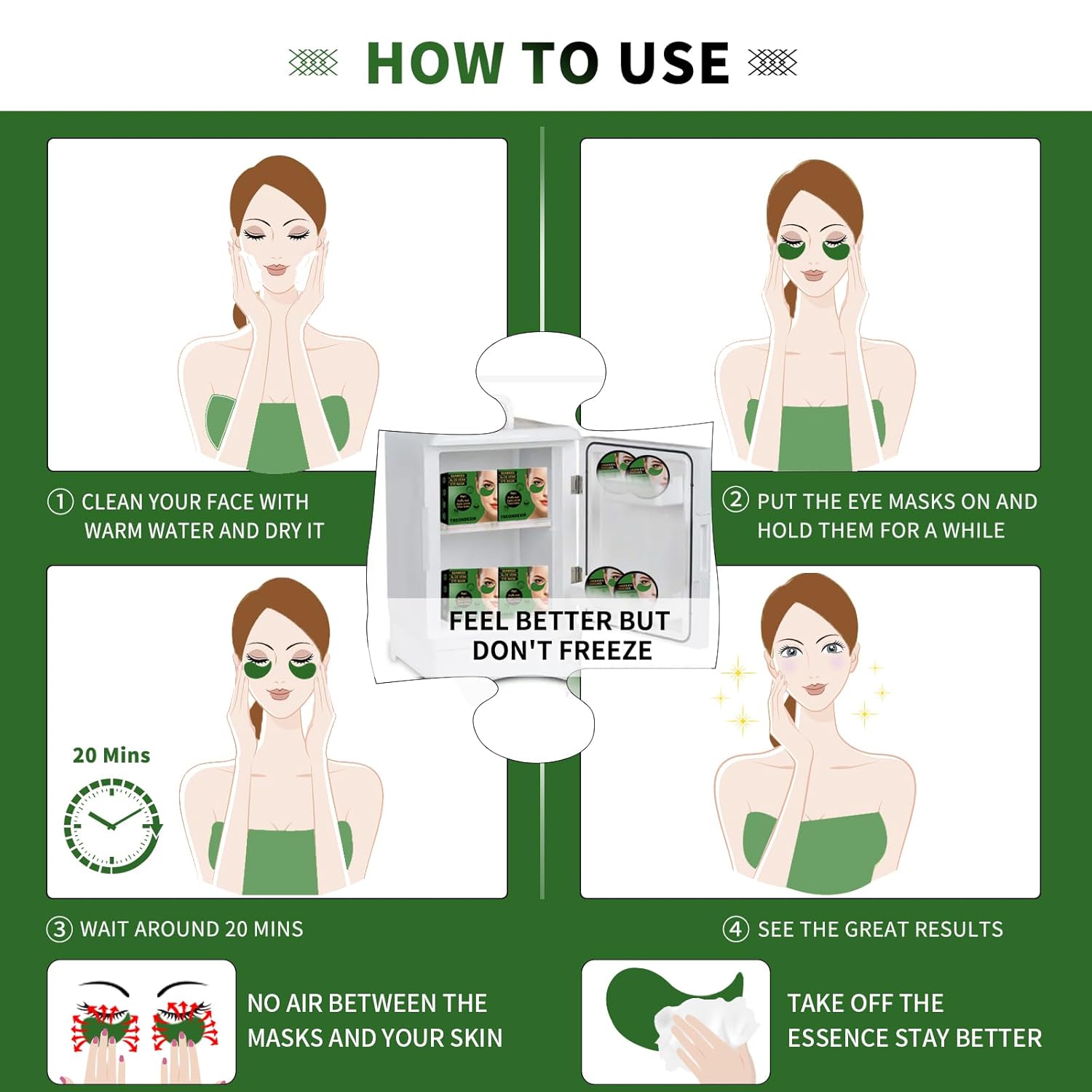 - Tips and Cautions: Our eye masks incorporate premium essence, which may initially slide upon application. Ensure there is no air between your skin and the mask, and then hold the mask in place around 1 minute. Alternatively, you can remove excess essence, ensuring the eye masks stay in position. For optimal results, we recommend using the eye patches daily. Storing the eye patches for dark circles in the fridge before use can enhance the experience, but please refrain from freezing them.