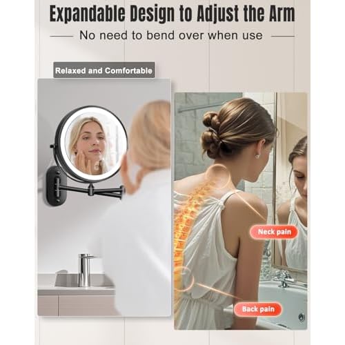 - 360¡ÆRotation & Extendable Arm Makeup Mirror: The multiple joints of the wall-mounted bathroom makeup mirror with retractable arm allows you to fix the mirror in the best position and adjust the arm to any angle you need to achieve perfect viewing. The flexible mirror arm can be freely extended so that the magnifying mirror can be adjusted to the right viewing angle and distance, allowing you to freely apply makeup, shaving or wearing contact lenses, etc. It can be folded against the wall to save space when not in use. This versatility makes it ideal for any bathroom or vanity setup.