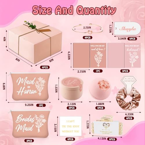 - Bridesmaid Proposal Gifts:each proposal gifts box include:scented candle x1pc;60g rose salt ball x1pc;make-up bag x1pc;hair clipx1pc;bridesmaid satin scrunchies x1pc;pearl claw clip x1pc;rose gold knotted bracelet x1pc;pink proposal box x1pc;will you be my bridesmaid card,80g Lafite grass.
