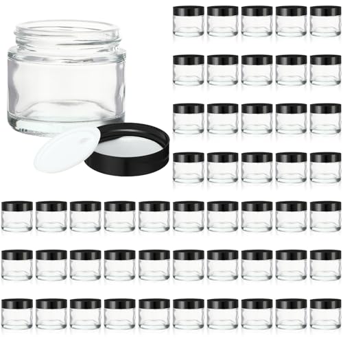 50 Pcs 2 oz Clear Glass Jars with Black Lids Leakproof Round Airtight Jars Empty Cosmetic Jars with Inner Liners Lid for Candle Making Storing Lotions Spice Powder Liquid Sample Makeup (Black,clear)