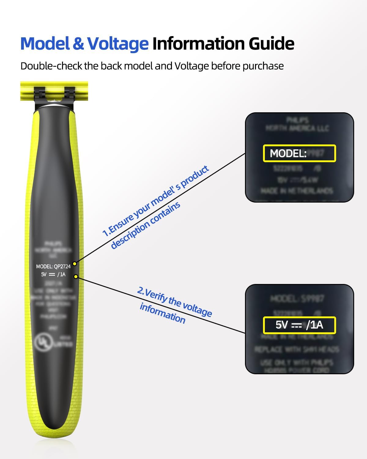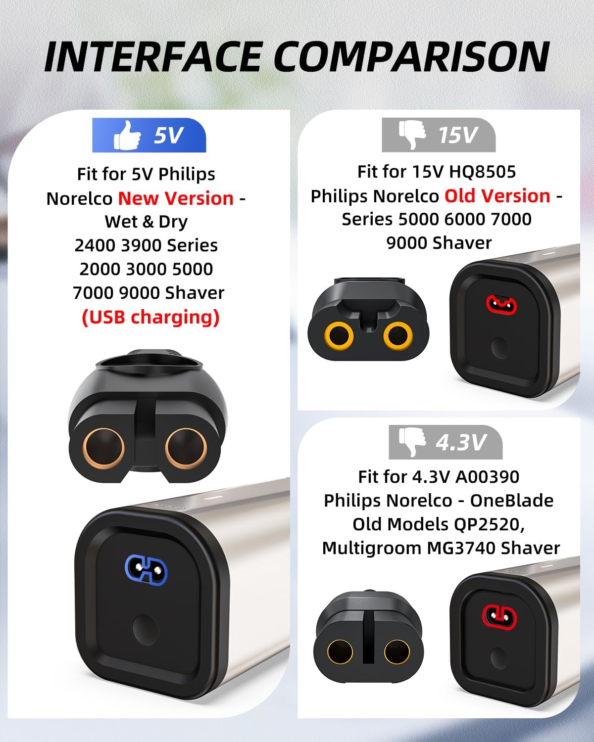 - Attention: Double-check that your device model matches the compatible ones listed before purchasing to ensure compatibility. Verify voltage and connector from the image, not fit for 15V - BG7030 BG7040 BG5025 S9987 QP6531 QP6530 QP6520 MG5750 MG7750 MG7770 MG7790 Shaver, 4.3V - A00390 QP2520 QP2521 QP2522 MG3740 Shaver, 8V - HQ850 QP2530 QP2630 Shaver