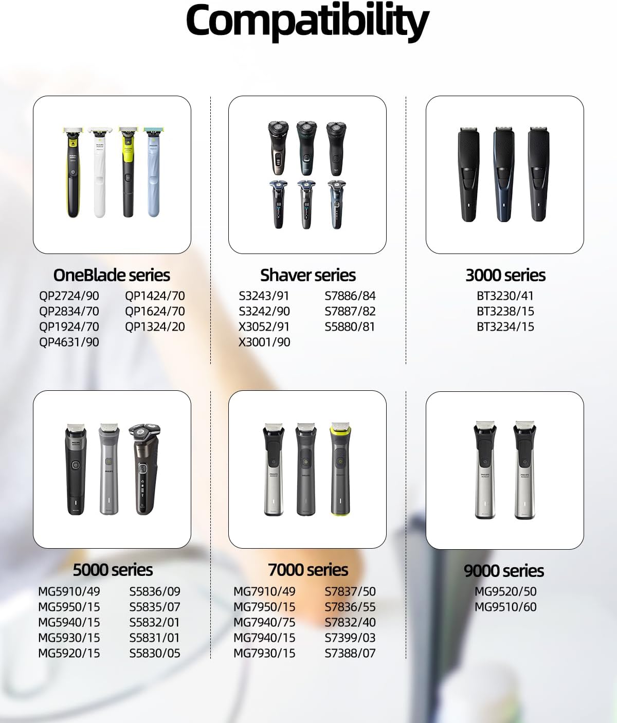 Compatible with Philips QP2724/90, QP2834/70, MG5910/49, MG5900/49, MG7910/49, MG7900/49, MG9510/60 Electric Shaver 360 Beard Trimmer Razor. Compatible with Philips Norelco Series (2400) X3001/90, (2600) X3052/91, (3600) S3243/91, (3900) S3341/92, (5400) S5880/81, (5000X) X5004 X5006, (7200) S7887/82 (i9000) X9000/90 X9001/91 X9002/82, (i9000 Prestige) XP9204/85 XP9203/81 XP9201/88, (i9000 Prestige Ultra) XP9403/88 XP9402/86 XP9401/92 XP9405/84 XP9400/89 Electric Shaver 360 Beard Trimmer Razor. (Not Applicable to Older Models)