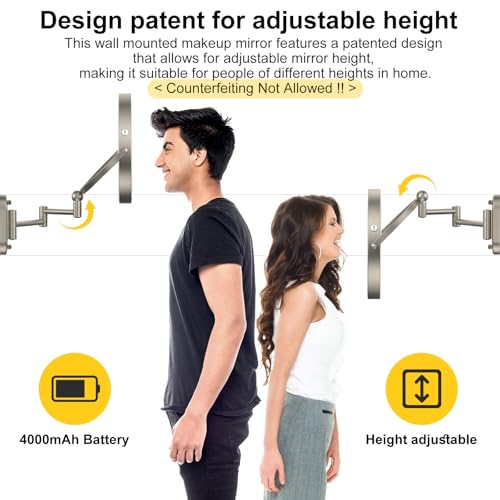 - Ajustable Brightness & 3 Colors Lighting: The light up mirror has 3 different lighting settings, including white light(7000K), natural light(5000K) and warm light(3000K) to help you get the ideal light for your makeup or read application. The stepless dimming feature allows you to adjust the brightness to your desired level, while the smart touch control makes it easy to switch between different lighting modes. This innovative lighted vanity mirror is the perfect addition to your beauty arsenal.This wall-mounted makeup mirror adopts a patented design with adjustable height. Counterfeiting will be prosecuted!