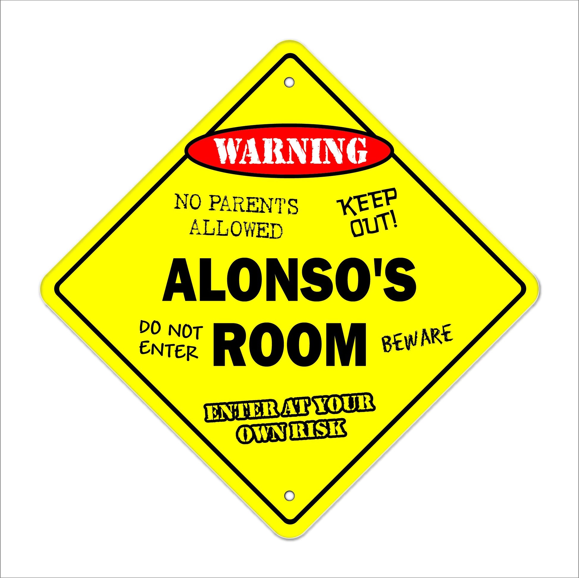 Details: Everybody loves personalized gifts and this is perfect for those kids in your lifeMade in the USA these signs are sturdy weatherproof plastic 12 tall and 12 wide diamond shaped with rounded corners and 2 cut mounting holes. Made TolastMade from a special plastic desgined to hold up to a beating, This sign can bend with out breaking and will never chip or crack, the colorful lettering will last a lifetime indoors and up to 4 years in the sun for outdoor use. Safe for A Childs RoomOur signs have rounded edges and our made of a very strong but lightweight plastic so you can hang it in your childs room without the worry of it falling and hurting your child or cutting them with sharp edges. Product Details: Alonso's Room SignPre-Cut Mounting HolesIndoor and Outdoor UseRust and Fade ResistantOne-SidedScratch Resistant treated InkDimension: 12 Tall x 12 WideMade in the USAOutdoor Durable PlasticClick Add to Cart to get your Alonso's Room sign today and enjoy a good laugh each time you pass by!
