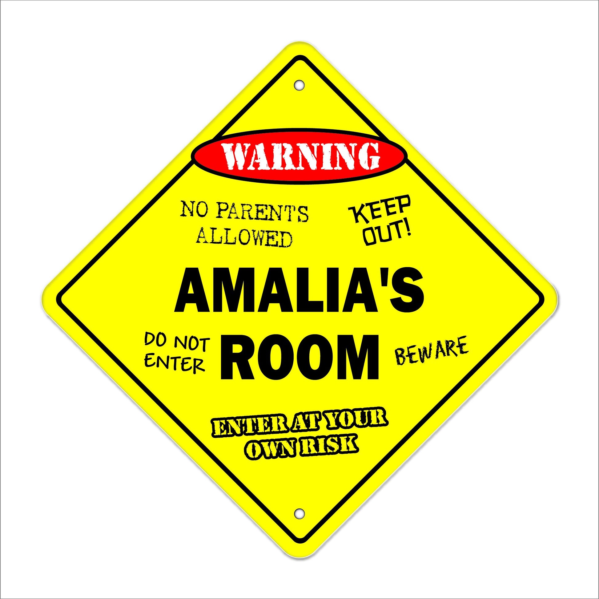 Details: Everybody loves personalized gifts and this is perfect for those kids in your life Made in the USA these signs are sturdy weatherproof plastic 12 tall and 12 wide diamond shaped with rounded corners and 2 cut mounting holes. Made To last Made from a special plastic designed to hold up to a beating, This sign can bend with out breaking and will never chip or crack, the colorful lettering will last a lifetime indoors and up to 4 years in the sun for outdoor use. Safe for A Childs Room Our signs have rounded edges and our made of a very strong but lightweight plastic so you can hang it in your child's room without the worry of it falling and hurting your child or cutting them with sharp edges. Product Details: Amalia's Room SignPre-Cut Mounting Holes Indoor and Outdoor Use Rust and Fade Resistant One - Sided Scratch Resistant treated Ink Dimension: 12 Tall x 12 Wide Made in the USA Outdoor Durable Plastic Click Add to Cart to get your Amalia's Room sign today and enjoy a good laugh each time you pass by!