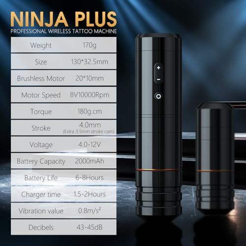 - Brushless Motor: The Ambition Ninja Plus tattoo pen powered by brushless motor(20*10mm). Drive with low vibration and is more powerful than the coreless motor, Less noise. Motor speed 8V 10000RPM,Working Voltage 3.7V.Low voltage with higher speed and torque, and easily drives any brand of tattoo needle cartridges.