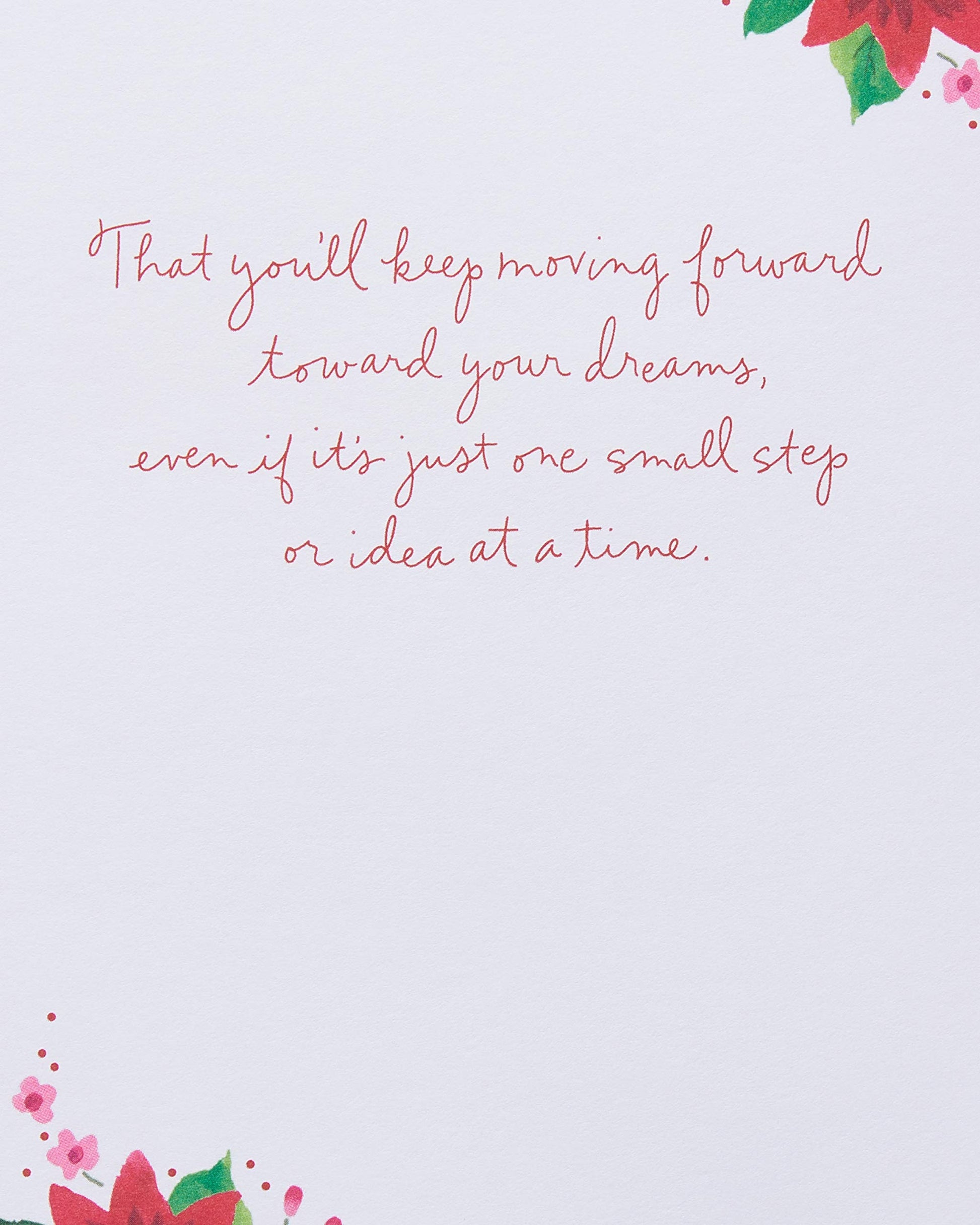 - Inside Message: That you’ll keep moving forward toward your dreams, even if it’s just one small step or idea at a time. That you’ll always find room in your life and your heart for the people and the things that make you happy. And that when you look in the mirror, you'll see a truly amazing woman. Merry Christmas