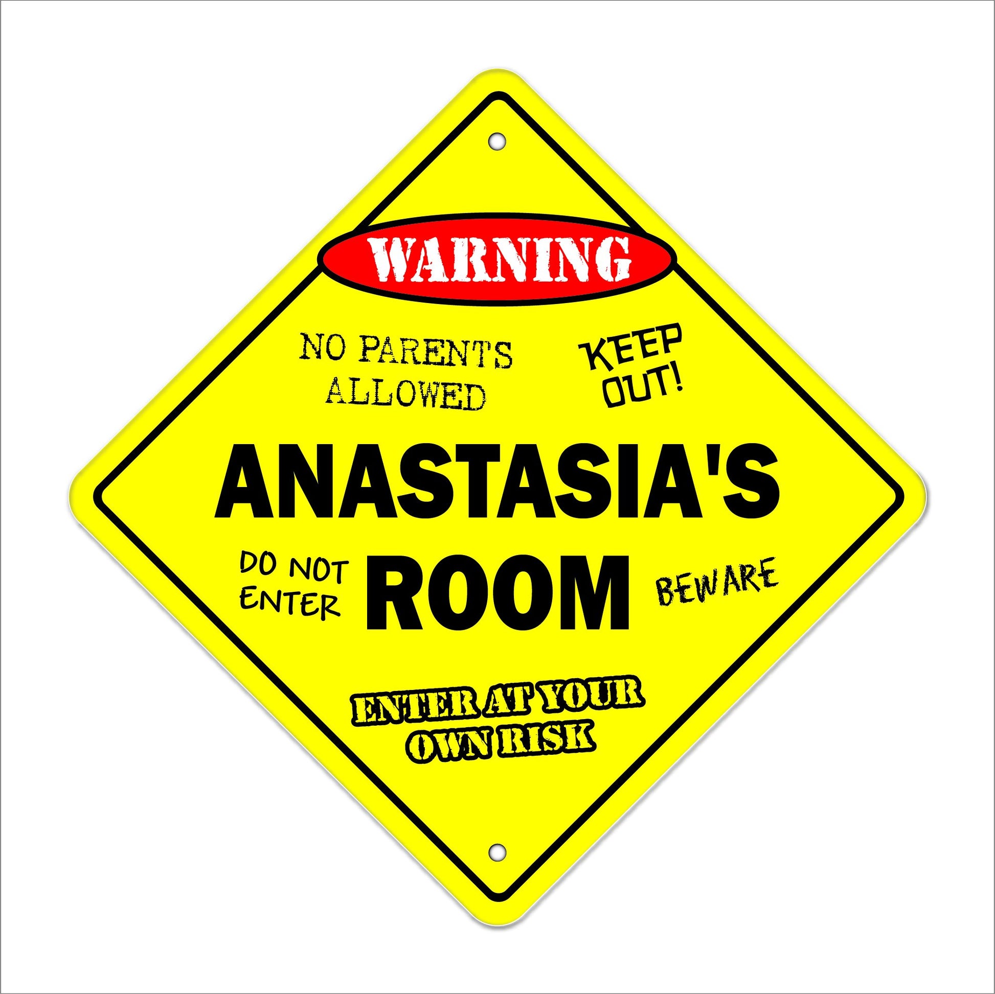 Details: Everybody loves personalized gifts and this is perfect for those kids in your life Made in the USA these signs are sturdy weatherproof plastic 12“ tall and 12“ wide diamond shaped with rounded corners and 2 cut mounting holes. Made ToastMade from a special plastic designed to hold up to a beating, This sign can bend with out breaking and will never chip or crack, the colorful lettering will last a lifetime indoors and up to 4 years in the sun for outdoor use. Safe for A Childs Room Our signs have rounded edges and our made of a very strong but lightweight plastic so you can hang it in your child's room without the worry of it falling and hurting your child or cutting them with sharp edges. Product Details: Anastasia's Room SignPre-Cut Mounting Holes Indoor and Outdoor Use Rust and Fade Resistant One-Sided Scratch Resistant treated Ink Dimension: 12 Tall x 12 Wide Made in the USA Outdoor Durable Plastic Click ‘ Add to Cart to get your Anastasia's Room sign today and enjoy a good laugh each time you pass by!