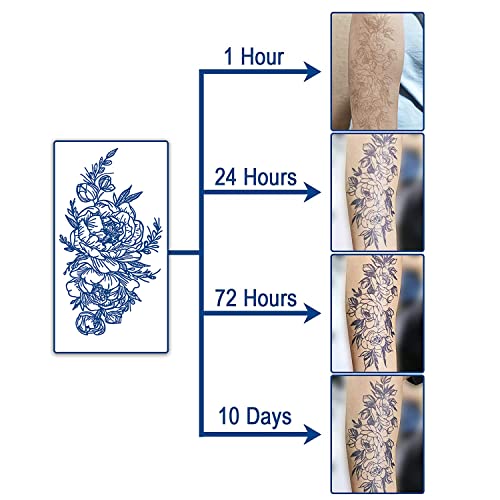 - Tattoo lasting:Tattoo sinks into the surface of the skin and develops into a dark blue color within 24-36 hours. It will last 2-3 weeks and over time the tattoo will fade until it disappears completely.