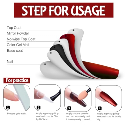 - ¡¼WIDE APPLICATION¡½:These powders need to be used with Gel nail polish(color gel,gel base coat and glossy gel top coat). Some regular Polish can also be used, but not all. These powders can be used on natural nails, UV gel nails, acrylic nails or false nail tips. You can use them very easily. It is a good solution with rhinestones ¡¢nail art fimo or other accessories to build a nice nail art.