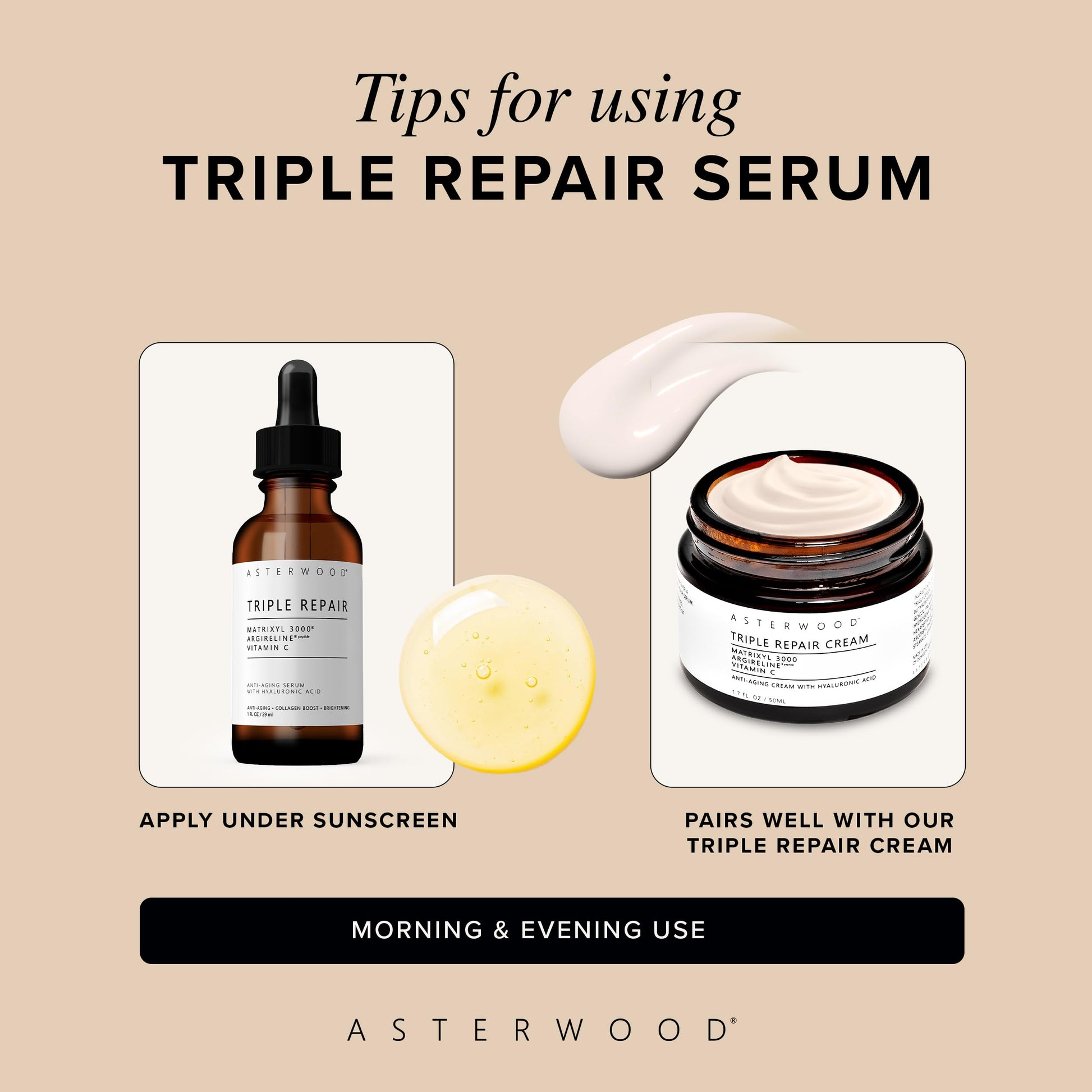 - Firmer, Younger Looking Skin: Unlock your best skin at any age with Asterwood Triple Repair Serum. The powerful trio of Matrixyl 3000, Argireline peptides and Vitamin C work together to smooth expression lines, target deep wrinkles, and more.
