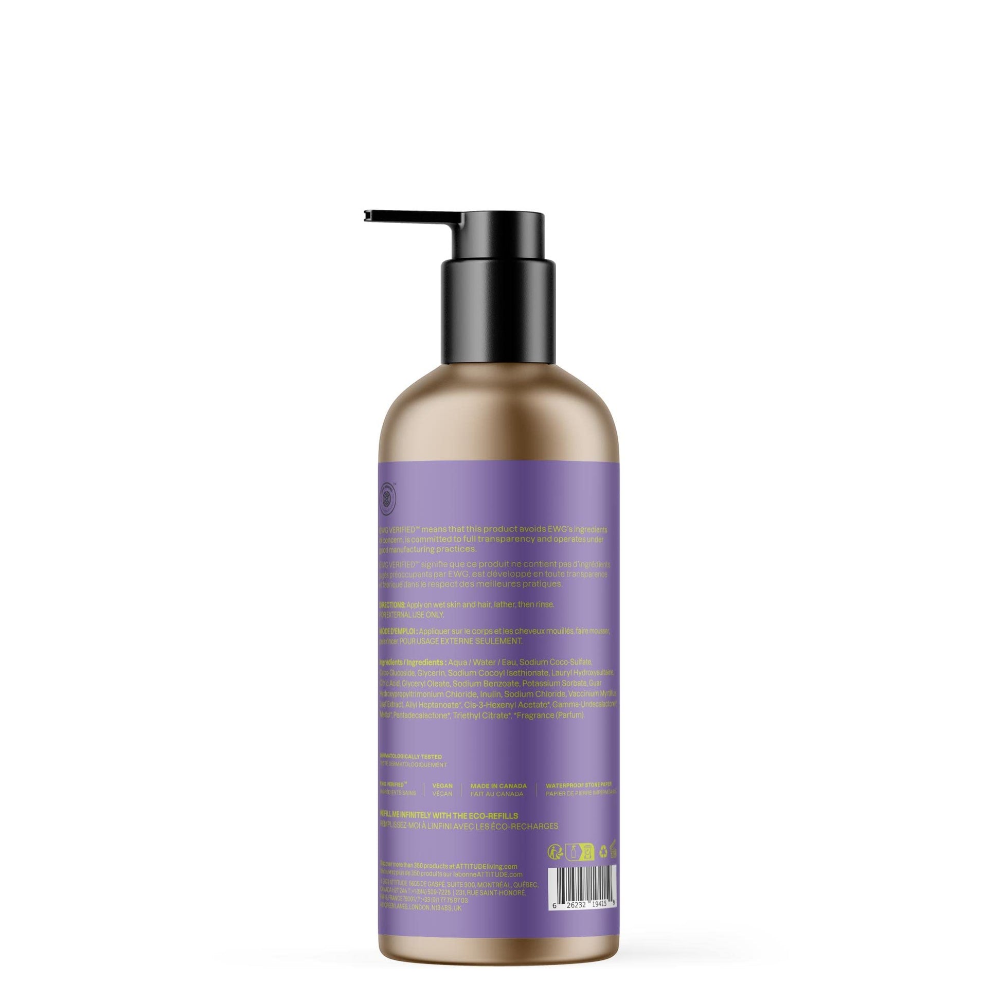 Details: Make bath time a playful ritual with ATTITUDE Super leaves Kids 2-in-1 Shampoo and Body Wash – Pear & Vanilla. This EWG VERIFIED kids shampoo and body wash is made with clean ingredients that meet the Environmental Working Group’s strict standards, making it perfect for your child’s daily body care routine. Formulated with 97% natural-origin ingredients¹, including soothing blueberry leaf extract, this shampoo for kids is crafted without silicones or SLES for a gentler experience on sensitive skin. It lathers into a creamy kids soap texture that envelops the body and hair, leaving skin soft and clean. It's gentle formula is great for kids and the whole family too. Infused with a fruity scent of juicy pear and soft vanilla with warm musk notes, this 2-in-1 formula brings comfort and fun to bath time. For a full kids body care ritual, pair it with our kids bath soap or kids lotion. This vegan and dermatologically tested kids body wash and shampoo comes in a sturdy, recyclable aluminum bottle and can be reused and refilled with our FSC-certified cardboard eco-refill to help reduce plastic waste. ¹Based on ISO 16128 standard.