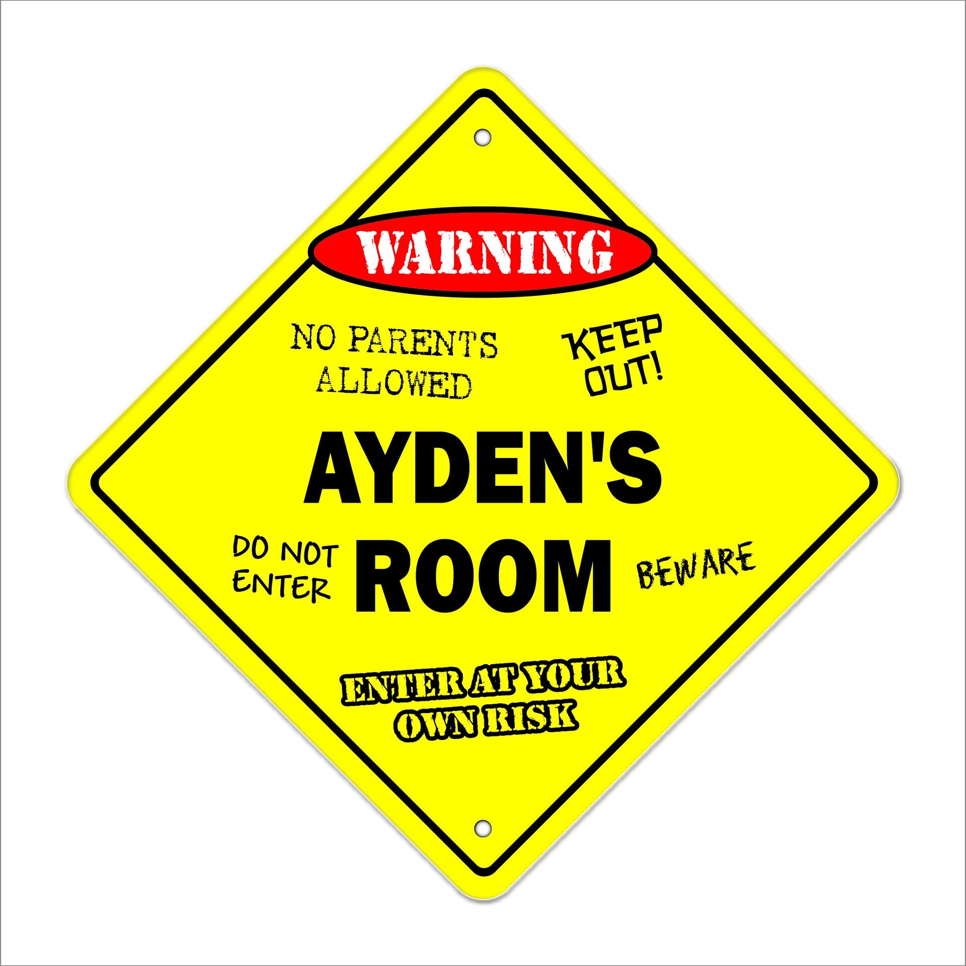 Details: Everybody loves personalized gifts and this is perfect for those kids in your life Made in the USA these signs are sturdy weatherproof plastic 12 tall and 12 wide diamond shaped with rounded corners and 2 cut mounting holes. Made To last Made from a special plastic designed to hold up to a beating, This sign can bend with out breaking and will never chip or crack, the colorful lettering will last a lifetime indoors and up to 4 years in the sun for outdoor use. Safe for A Childs Room Our signs have rounded edges and our made of a very strong but lightweight plastic so you can hang it in your child's room without the worry of it falling and hurting your child or cutting them with sharp edges. Product Details: Ayden's Room Sign Pre-Cut Mounting Holes Indoor and Outdoor Use Rust and Fade Resistant One-Sided Scratch Resistant treated Ink Dimension: 12 Tall x 12 Wide Made in the USA Outdoor Durable Plastic Click Add to Cart to get your Ayden's Room sign today and enjoy a good laugh each time you pass by!