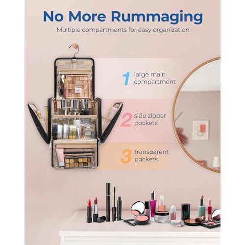 - ¡¼Easy to Use¡½: With 3 transparent pockets, this hanging makeup bag organizer makes it effortless to keep your essentials organized. The left side pocket features a stain-resistant PVC lining, which is tailored to store makeup brushes, powder puffs, sponges, and other items that require special consideration. The top and bottom transparent pockets provide additional storage space while ensuring easy accessibility to small items.