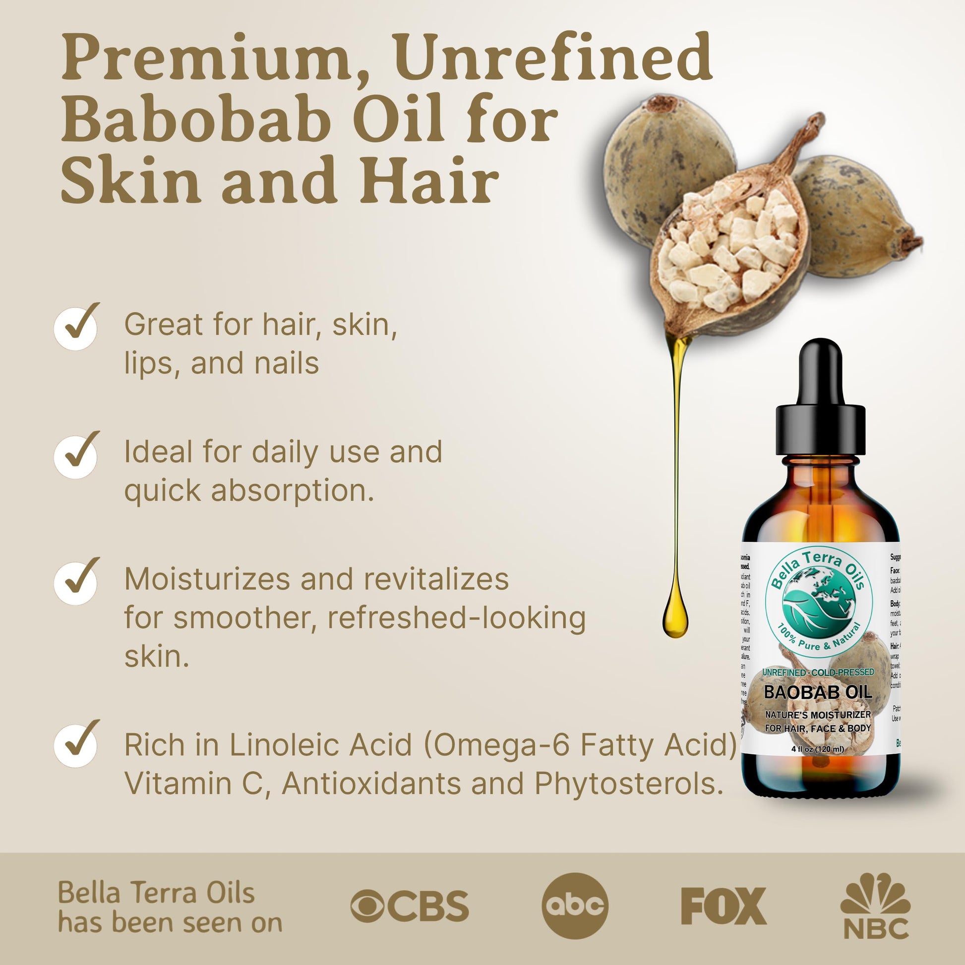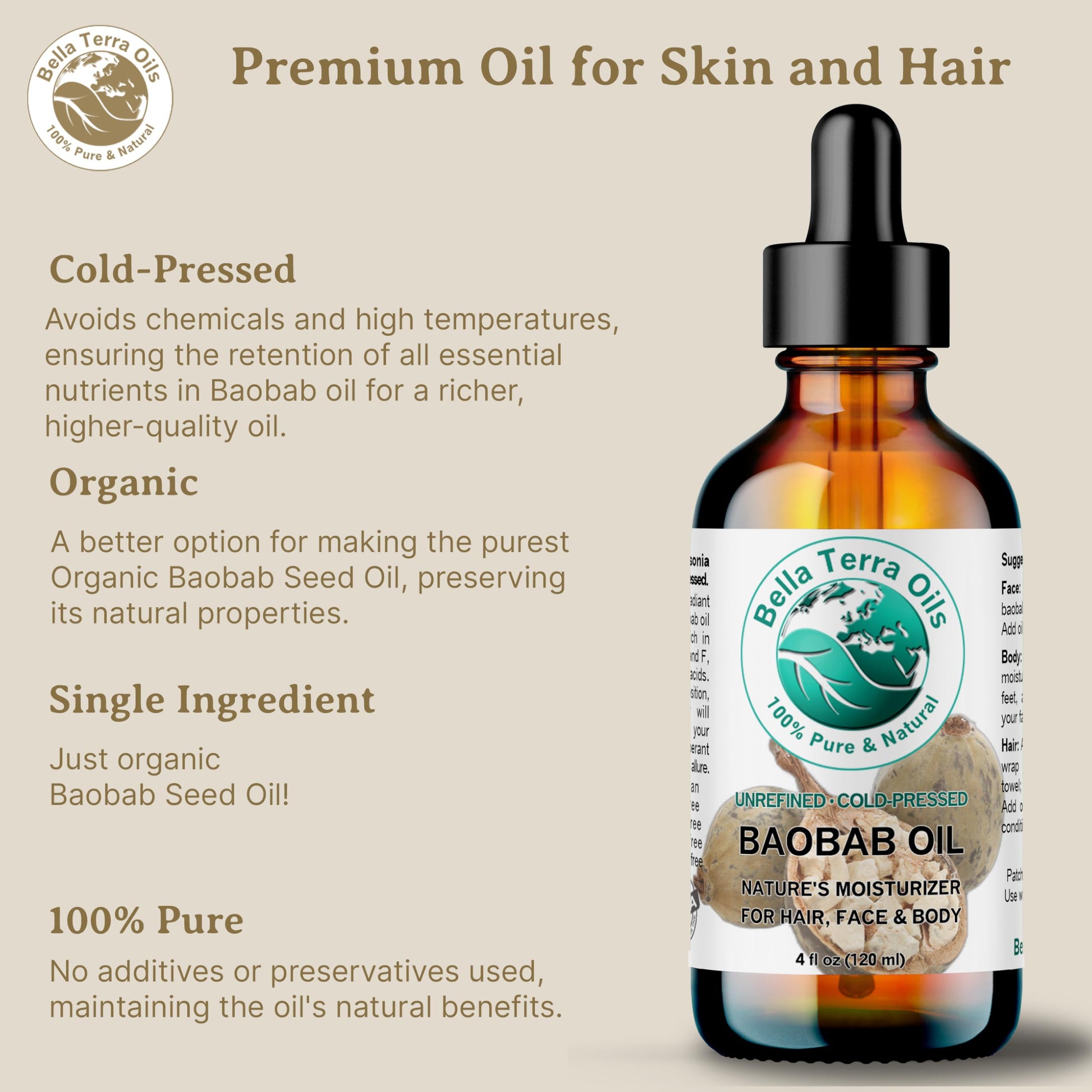 Bella Terra Oils - Baobab Oil 4 oz - Dive into The Essence of African Treasure, Abundant in Antioxidants, Best for Achieving a Silky Skin Glow