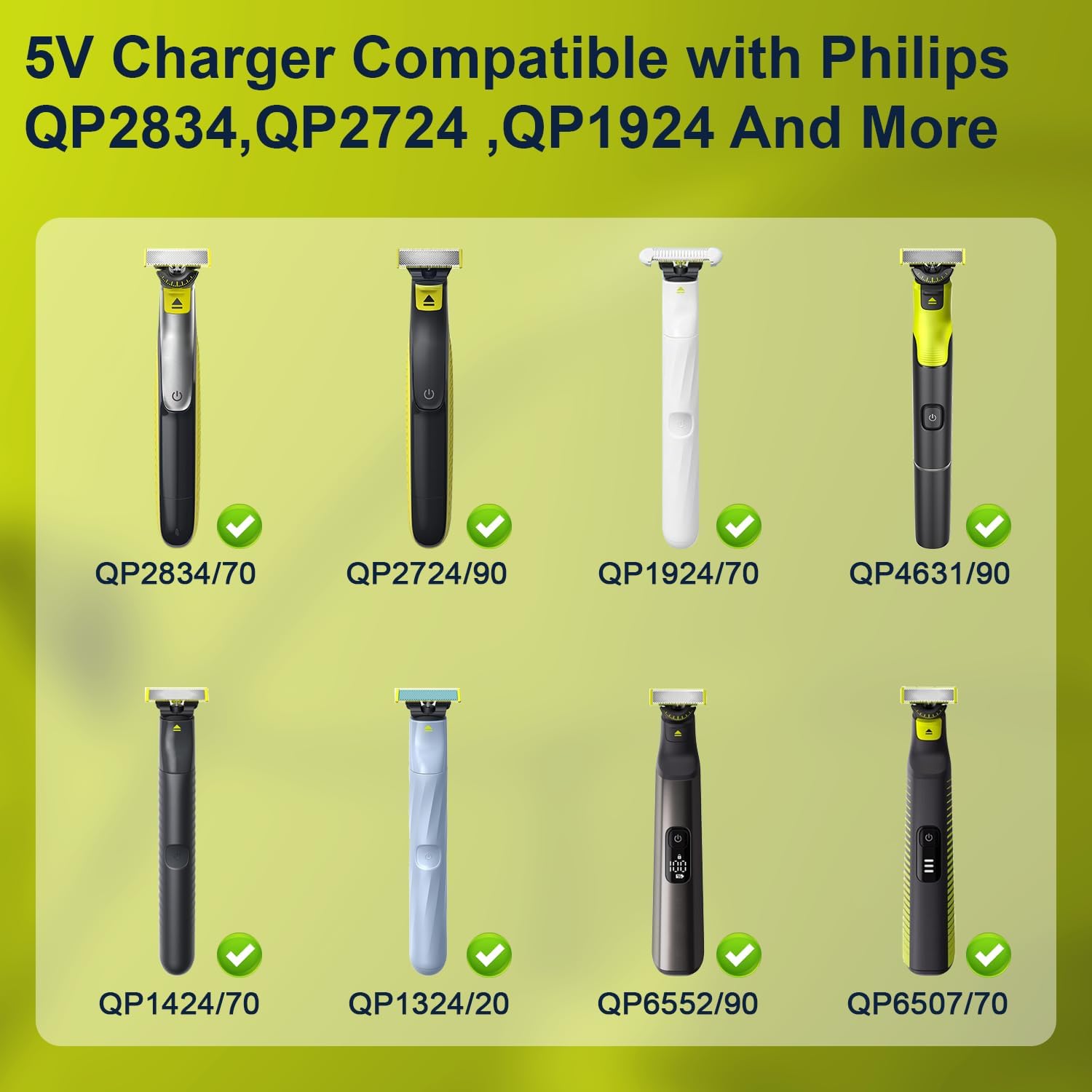 - 5V1A Charger Cable: Compatible with Philips Norelco One Blade Latest Version QP2724 QP2834 QP1324 QP4530 QP1924 QP4631 QP6507 QP4631 QP6552 360 Face + Body Hybrid Electric Trimmer(Not Applicable to Old Versions)