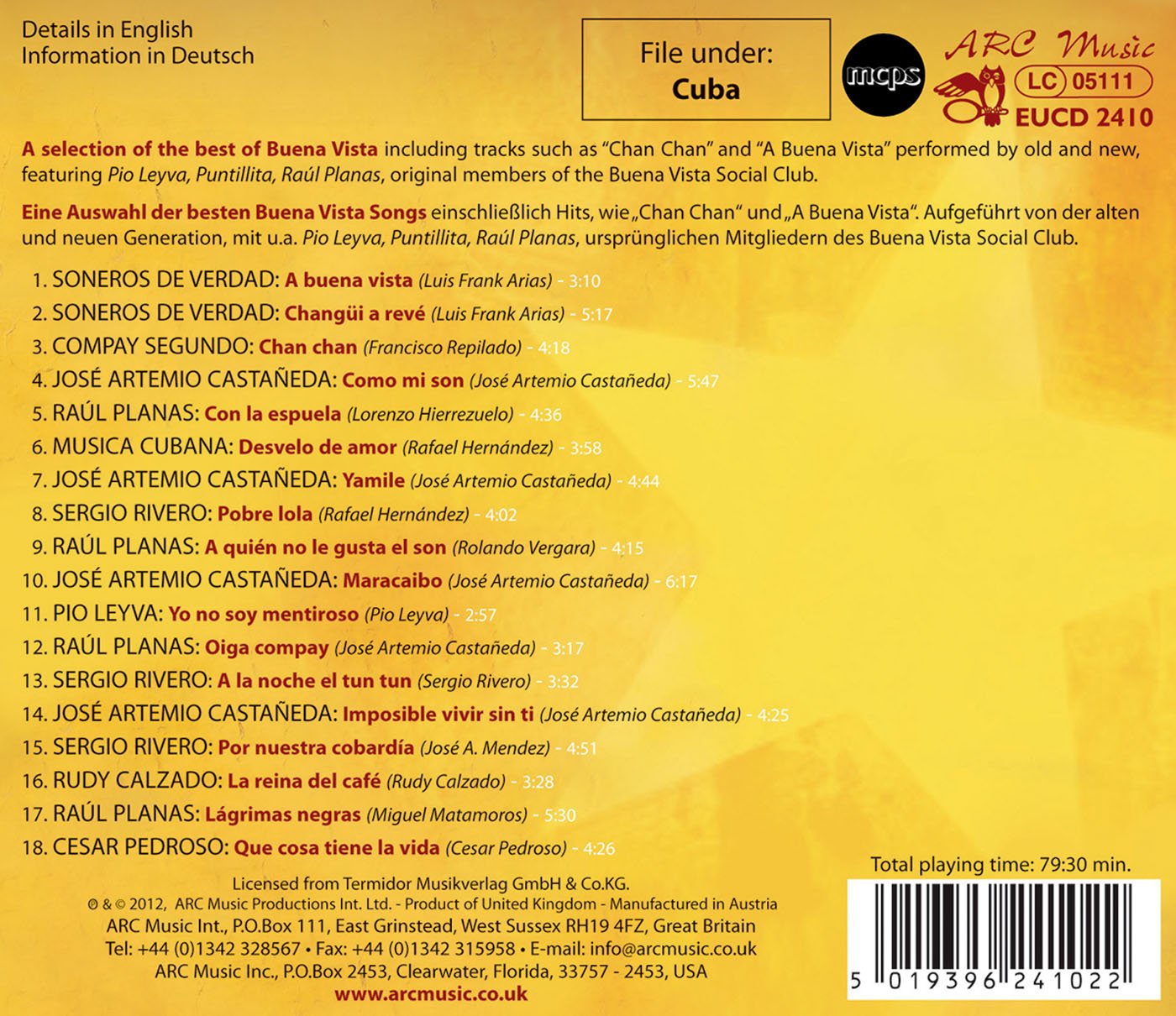 Details: Featuring original members of the Buena Vista Social Club, this selection of the Best of Buena Vista includes tracks such as "Chan Chan," "A Buena Vista," and other fantastic, exotic movements.
