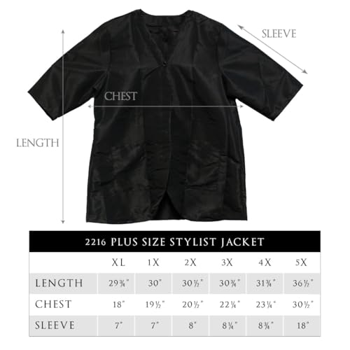 - FLATTERING A FULLER FIGURE: The stylish cut of this stylist jacket is specifically designed for larger figures. The Plus Size Stylist Jacket features 3/4 length sleeve design with button down front, as well as two convenient lower front pockets. Its design lends itself well to the barber profession as you will not only look the part but have convenient access to your tools at any time.
