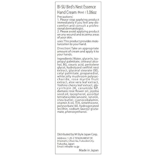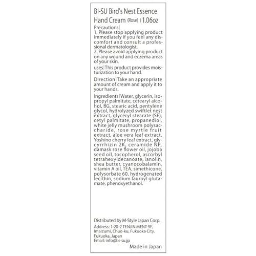 BI-SU Hand Cream | Hand Moisturizer, Natural Swiftlet Nests Extract, Collagen, Sialic Acid, Anti-aging Japanese Skincare, Prevents Dryness, Keeps Hands Soft, Rose Lover Scent, 1.06oz, 30g