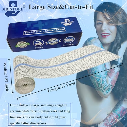 - Cut-to-Fit&Easy Application:The size of our bandage is 7.87" x 11 Yard(20cmx1000cm),which is large and long enough to accommodate various tattoo sizes and long time use.You can easily cut it to fit your specific tattoo dimensions.Meanwhile,our bandage is easy to apply with its simple peel-and-stick design. No need for complicated wrapping or taping. Just apply it directly to your tattooed area.