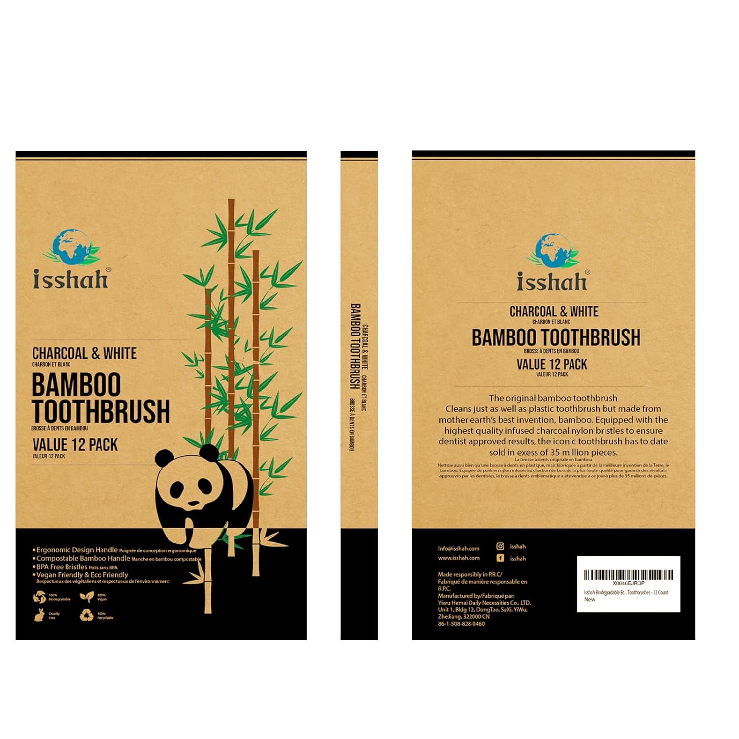 Biodegradable Eco-Friendly Natural Bamboo Charcoal Toothbrushes, FSC Certified and PETA Approved - 12 Count