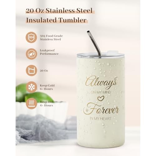 - Large Capacity Stainless Tumbler: Crafted from high-quality 304 stainless steel, this 20oz tumbler is safe, durable, and expertly insulated to keep drinks at the perfect temperature for up to 6 hours. It is perfect for all her favorite beverages, and it features the heartfelt phrase "Always in my mind." More than just practical, it's a daily token of your love?designed to make her feel cherished with every sip. Ideal as birthday gifts for women, thank you gifts, self care gifts, thinking of you gifts, friendship gifts and retirement gifts