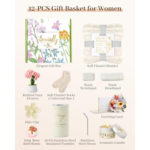 - 12-PCS Birthday Gifts for Women: This gift basket for women includes: 1x 20oz stainless steel tumbler, 1x straw, 1x soft flannel blanket, 1x aromatic candle, 1x rose bath bomb, 1x flannel socks, 1x knitted yarn flower, 1x hair clip, 1x wash headband, 1x wristband, 1x greeting card, 1x elegant gift box. Each item is thoughtfully selected to make her feel deeply loved and show your unique thoughtfulness. It is the perfect birthday gift to make her celebration even more special
