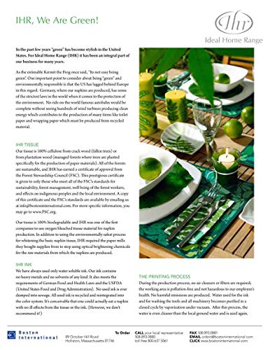 Details: Create dynamic tablescapes and stunning place settings by pairing Ideal Home Range's patterned napkins with matching plates and coordinating solids. Plates and napkins are offered in multiple sizes, allowing you to mix and match, layer and customize. For weddings and cocktail parties to summer BBQs and everyday use, choose from a variety of designs just right for your next event or get together. Ideal Home Range offers a sustainable option for conscientious consumers; napkin tissue is 100% cellulose from cracked wood (fallen trees) and plantation wood (managed forests where trees are planted specifically for the production of paper materials) and all tissue is oxygen bleached without the use of chlorine. IHR ink is water soluble, contains no heavy metals or solvents of any kind and meets the requirements of German Food and Health laws and the USFDA. Used ink is never dumped into sewage and is always recycled and reintegrated into the color system. The production working area is naturally pollution-free and no harmful emissions are produced. IHR has earned a certificate of approval from the Forest Stewardship Council (FSC), a prestigious certificate only awarded to those who meet all of the FSC's standards for sustainability, forest management, well being of the forest workers and effects on indigenous peoples and the local environment. Ideal Home Range is exclusively represented in the United States by Boston International and is considered to be the international market leader and trendsetter in the field of high-class table decoration and interior accessories.