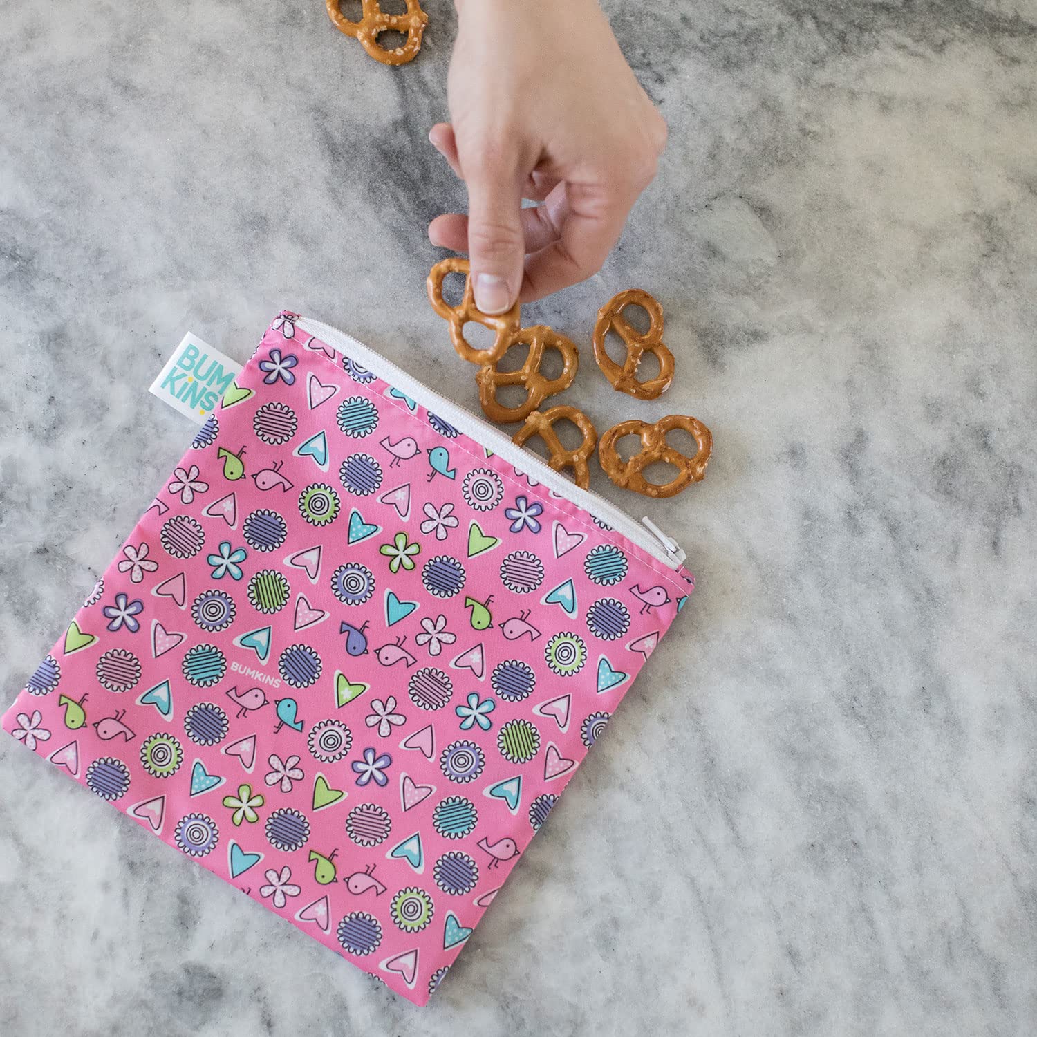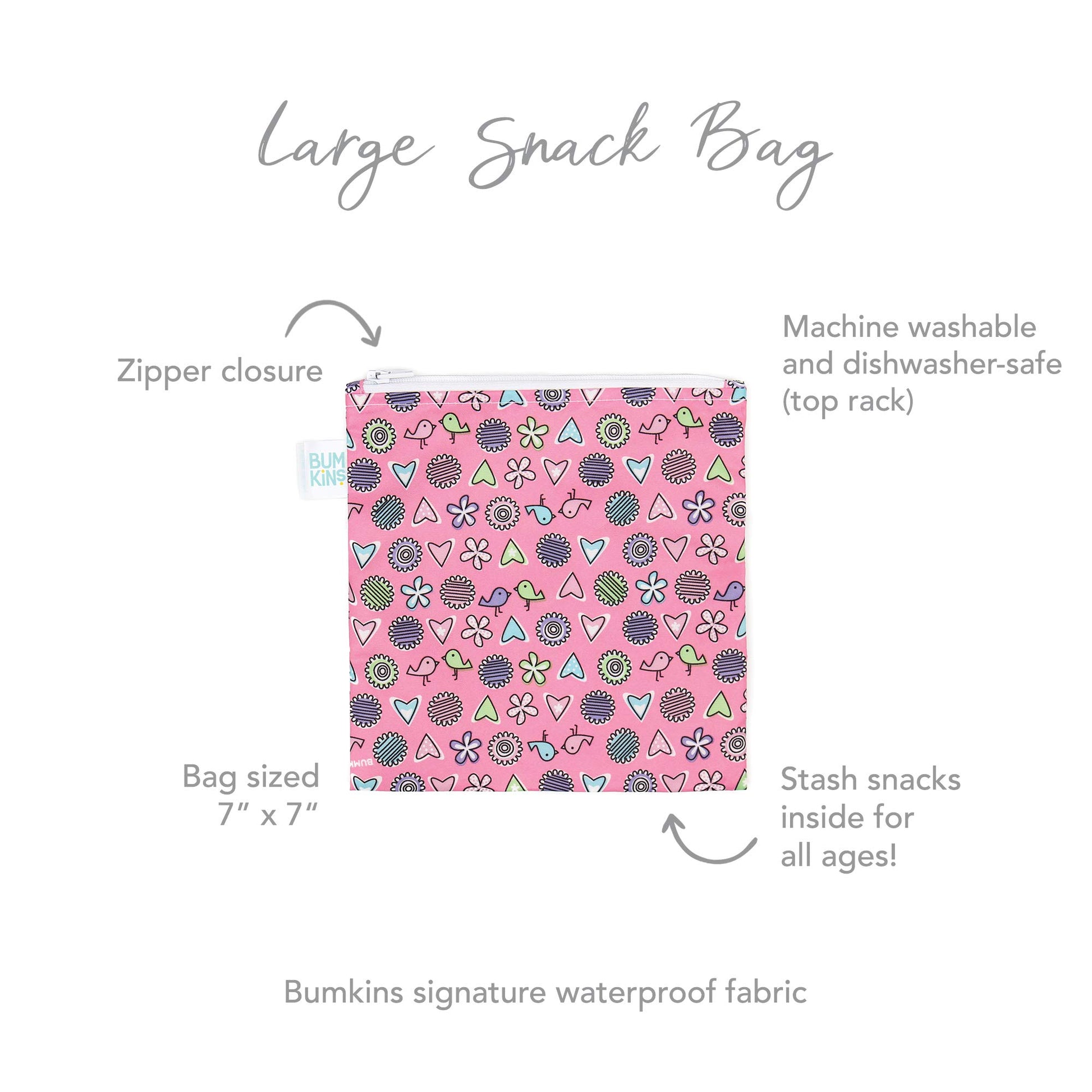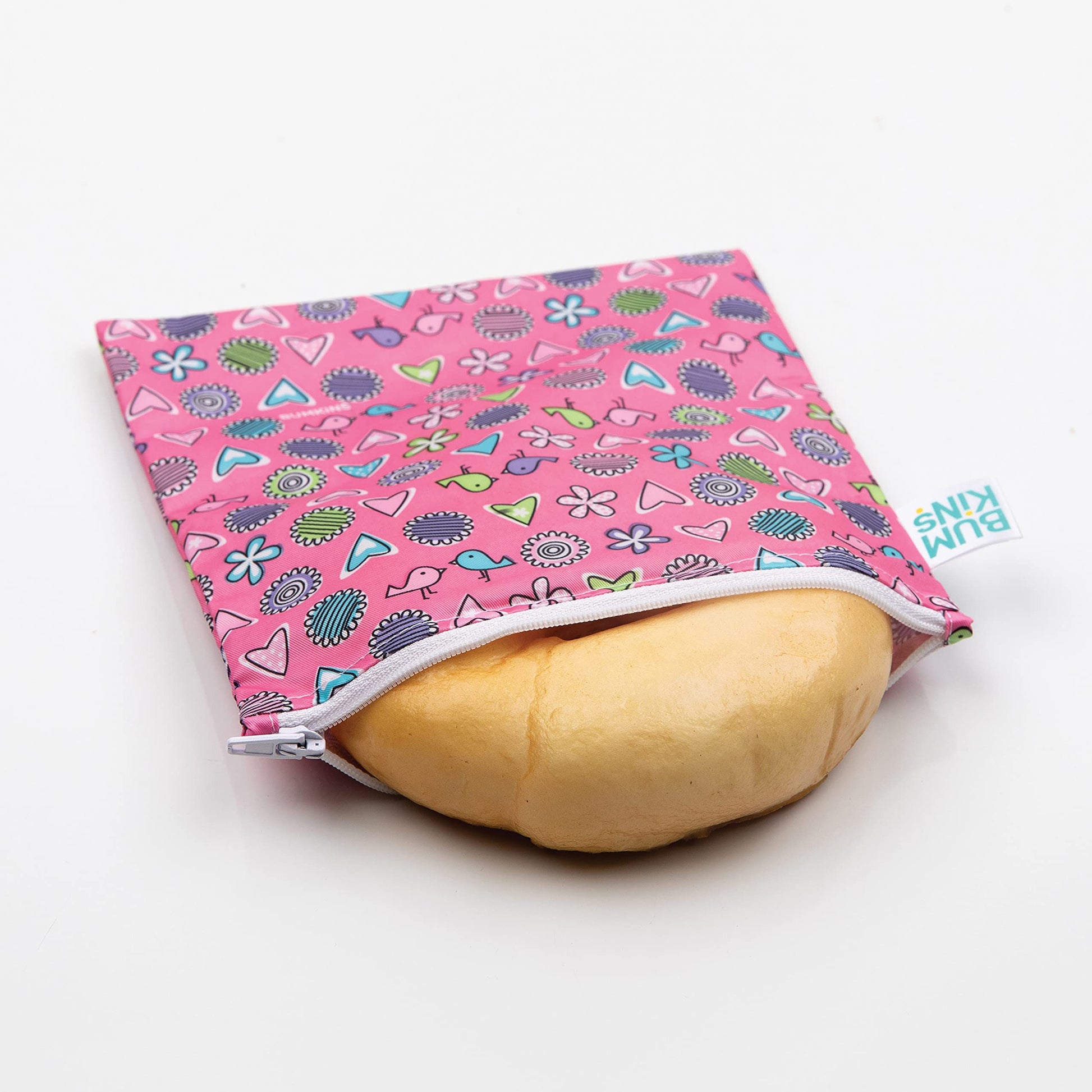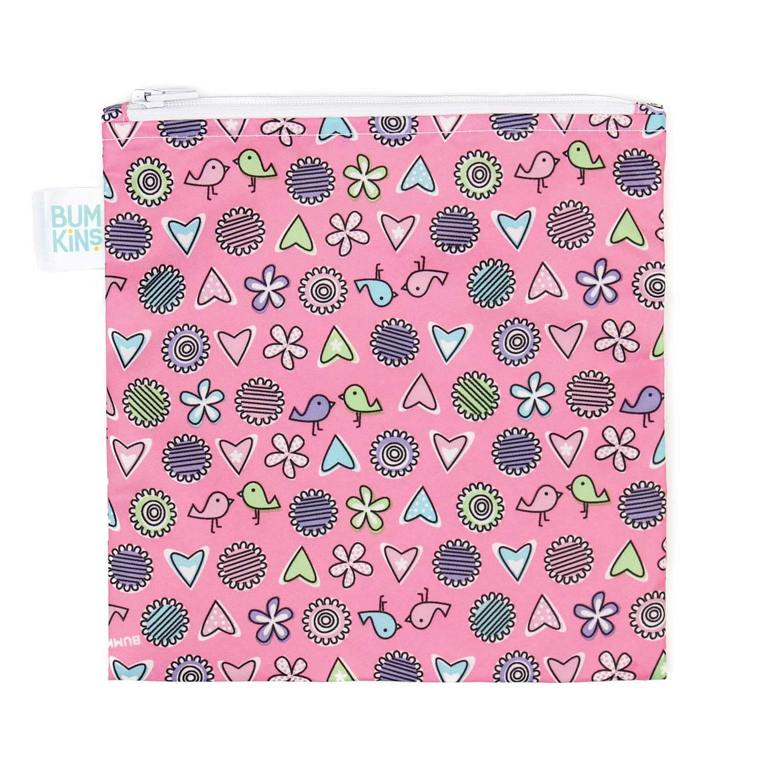 Bumkins Reusable Sandwich and Snack Bags, for Kids School Lunch and for Adults Portion, Washable Fabric, Waterproof Cloth Zip Bag, Travel Pouch, Food-Safe Storage, Large, Love Birds Pink