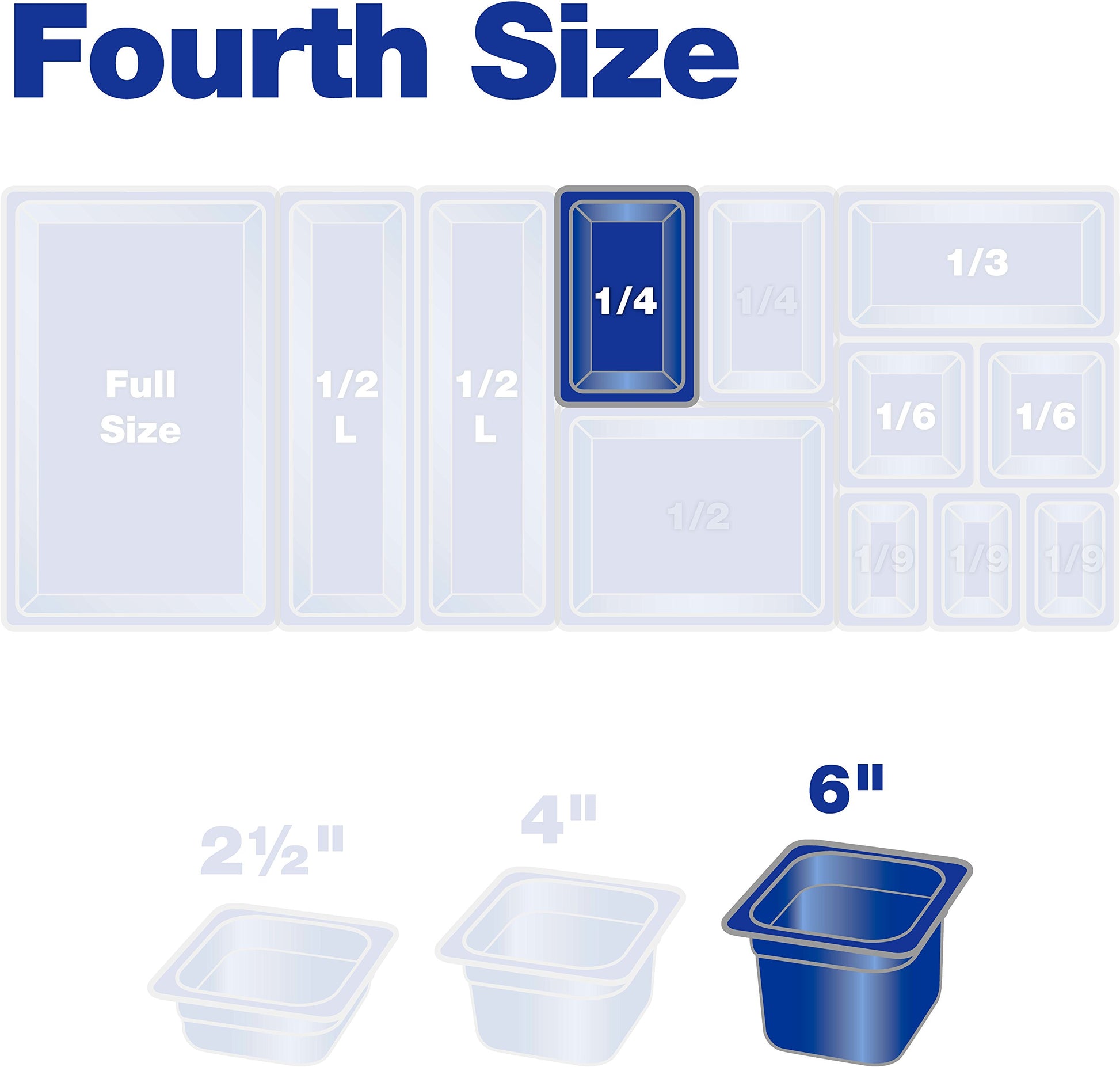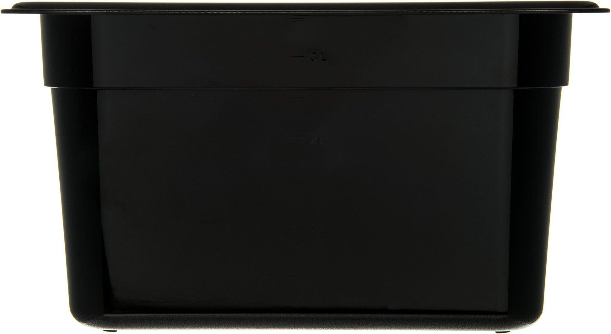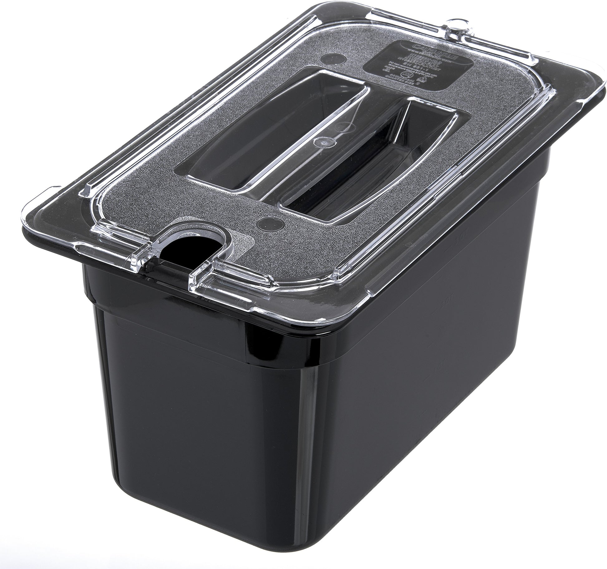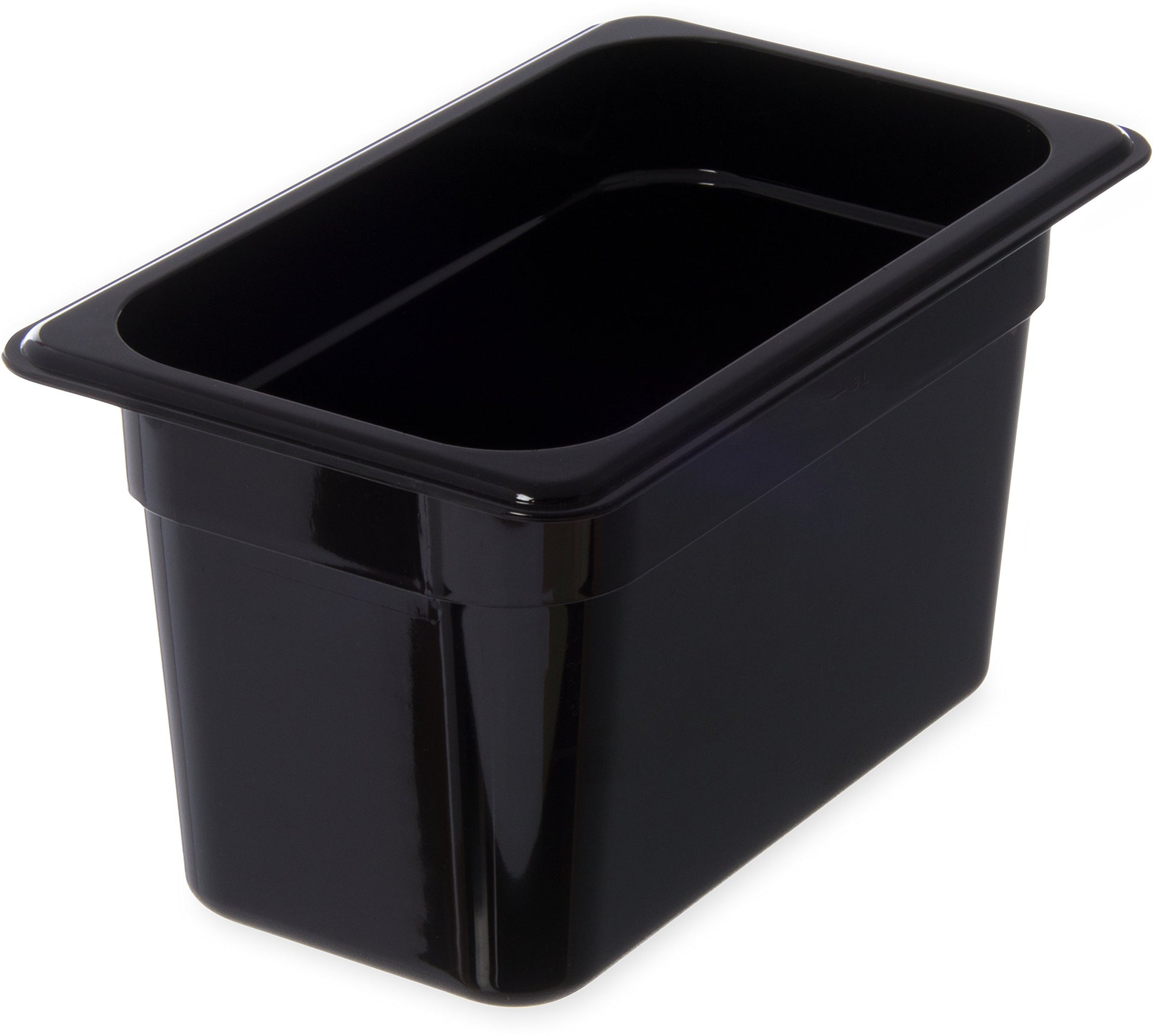 Details: The Carlisle 3068203 Quarter Size, 6" deep, polycarbonate food pan is a multipurpose food storage and presentation solution. Use the 4 quart pan in the kitchen for collecting or assembling fresh cuts and ingredients or to display finished foods and toppings at a buffet station. The temperature range (-40°F to 212°F) makes the pan ideal for freezing and warming applications. Molded-in capacity indicators (quarts and liters) display measurement and facilitate portion control. The pan is made of chip, crack and stain resistant polycarbonate plastic. Reinforced edges and corners endure daily stacking and bangs of professional use. The smooth rounded interior makes every scoop count and reduces food waste. The textured exterior edges resist scratching and offer improved handling. The pan is stackable for convenient storage. It is also compatible with Carlisle StorPlus Universal and Smart Lids (sold separately). The pan adheres to universal gastronorm catering industry size standards. It is NSF Listed and dishwasher safe. The black food pan has overall measurements of 10.25 x 6.38 x 6 inches (L x W x D).