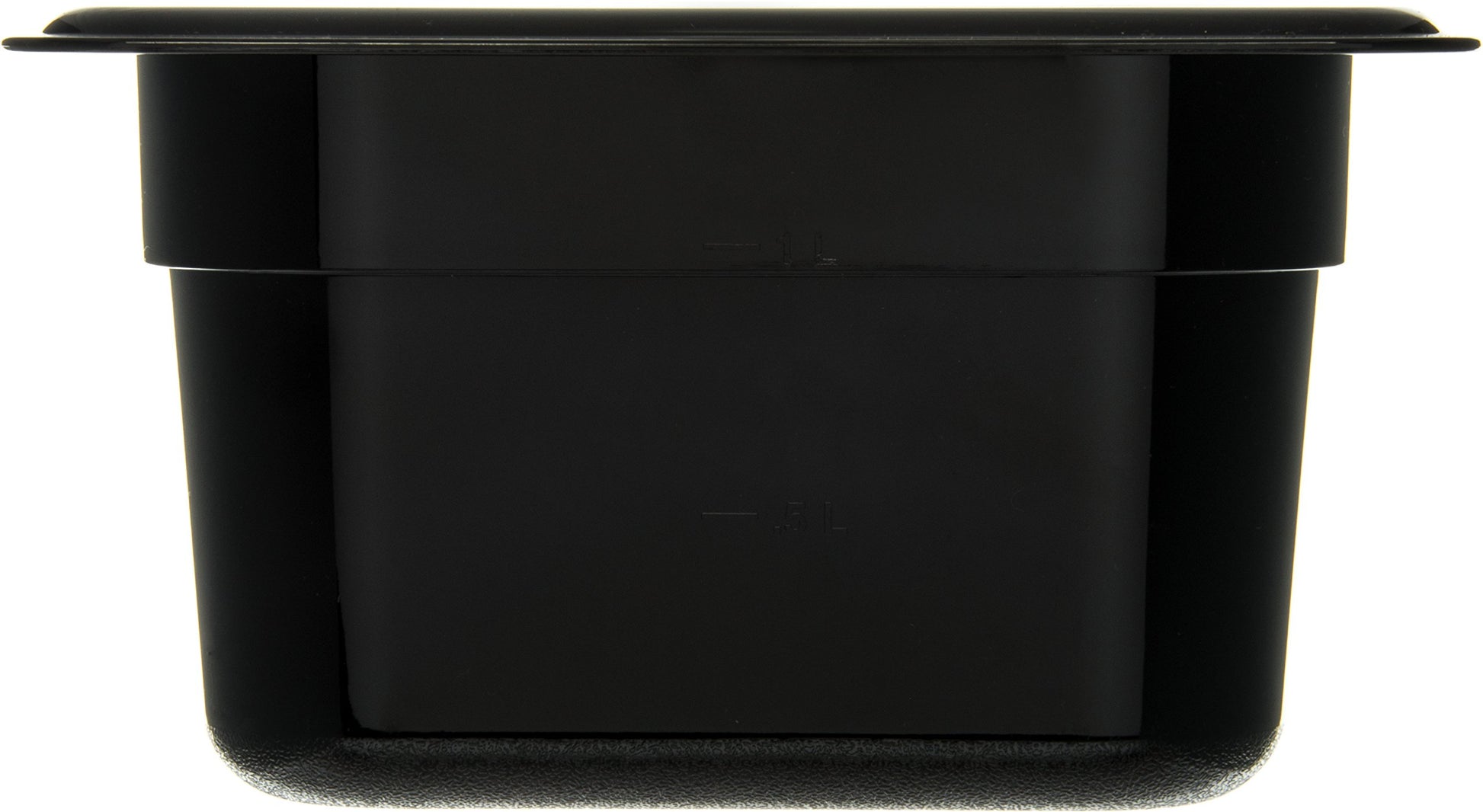 Details: The Carlisle 3068403 Sixth Size, 4" deep, polycarbonate food pan is a multipurpose food storage and presentation solution. Use the 1.7 quart pan in the kitchen for collecting or assembling fresh cuts and ingredients or to display finished foods and toppings at a buffet station. The temperature range (-40°F to 212°F) makes the pan ideal for freezing and warming applications. Molded-in capacity indicators (quarts and liters) display measurement and facilitate portion control. The pan is made of chip, crack and stain resistant polycarbonate plastic. Reinforced edges and corners endure daily stacking and bangs of professional use. The smooth rounded interior makes every scoop count and reduces food waste. The textured exterior edges resist scratching and offer improved handling. The pan is stackable for convenient storage. It is also compatible with Carlisle StorPlus Universal and Smart Lids (sold separately). The pan adheres to universal gastronorm catering industry size standards. It is NSF Listed and dishwasher safe. The black food pan has overall measurements of 6.75 x 6.38 x 4 inches (L x W x D).
