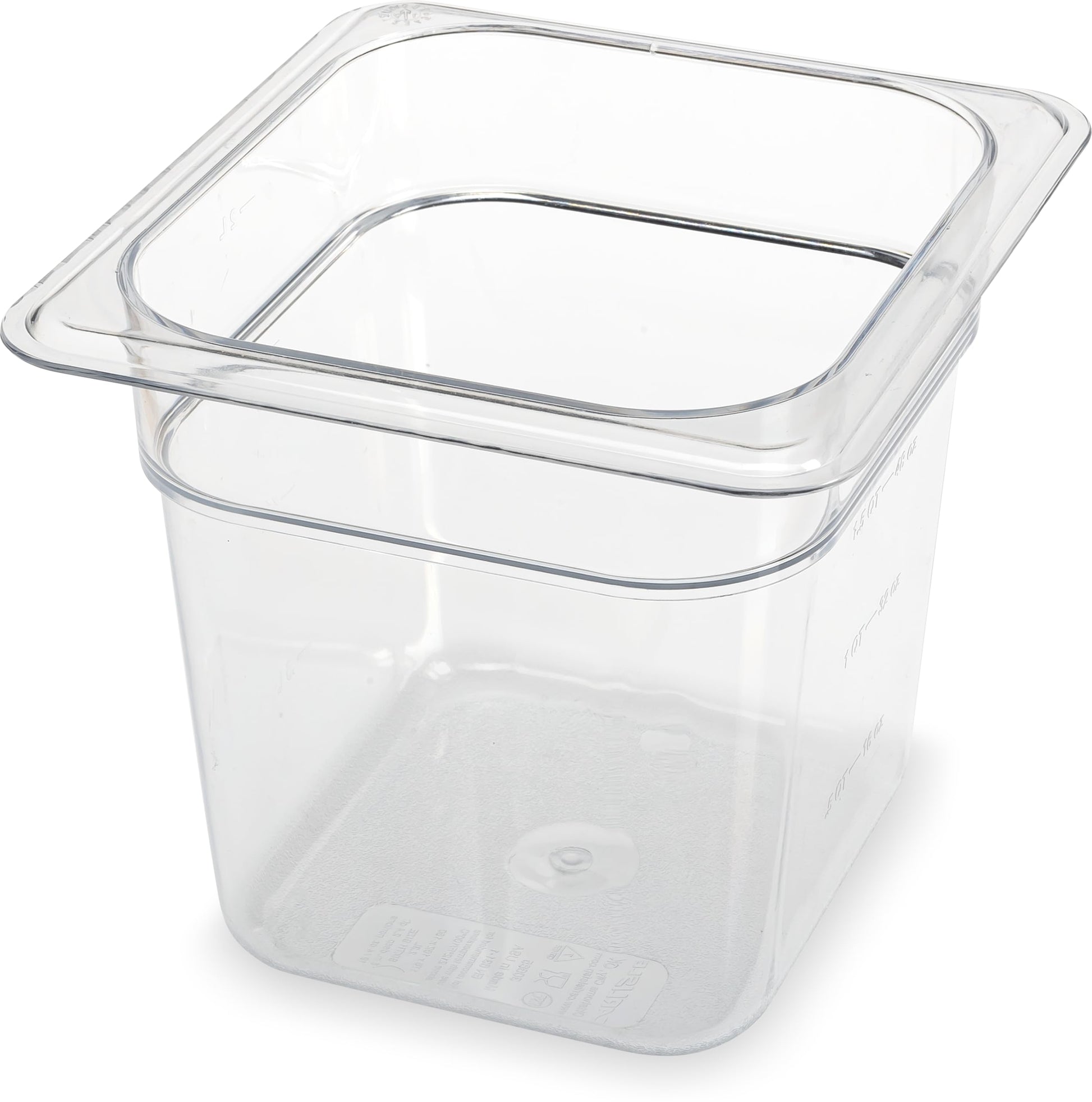 Details: This StorPlus Polycarbonate Food Pan is the ideal solution for your food storage needs. This 1/6 pan size, 6 inch deep pan is perfect for storing and organizing food items in your commercial kitchen, restaurant, or catering business. Crafted from durable polycarbonate material, this food pan is built to last. It features a spoonable bottom with rounded interior corners, ensuring that you can easily scoop out every last bit of food without leaving any behind. The reinforced rim and corners provide additional strength and stability, making it a reliable option for even the busiest kitchens. This food pan is stackable, allowing you to save valuable storage space. It also features a non-slip base, ensuring it stays securely in place when stacked. The clear construction of the pan allows for easy visibility of its contents, making it easy to identify food items at a glance. The StorPlus Polycarbonate Food Pan is dishwasher safe, making it easy to clean and maintain. It's also NSF listed, providing assurance that it meets the highest standards for food safety. And, it's proudly made in the USA, ensuring you receive a quality product that's built to last. Invest in the StorPlus Polycarbonate Food Pan today and enjoy the convenience, durability, and practicality it has to offer in your food storage and organization. (Model Number: 3068507).