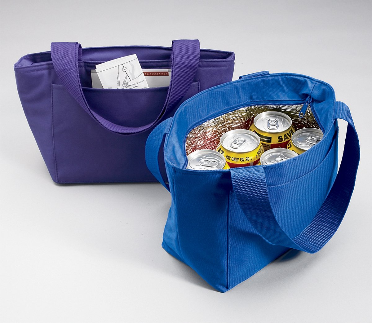 Details: Insulated cooler lunch bag - 600 denier polyester/pvc; zippered main compartment; matching 1.5 Wide handles, 7 drop length; color matched handles and zipper; aluminum foil insulated interior; six pack or great lunch cooler; front pocket; gusseted bottom.