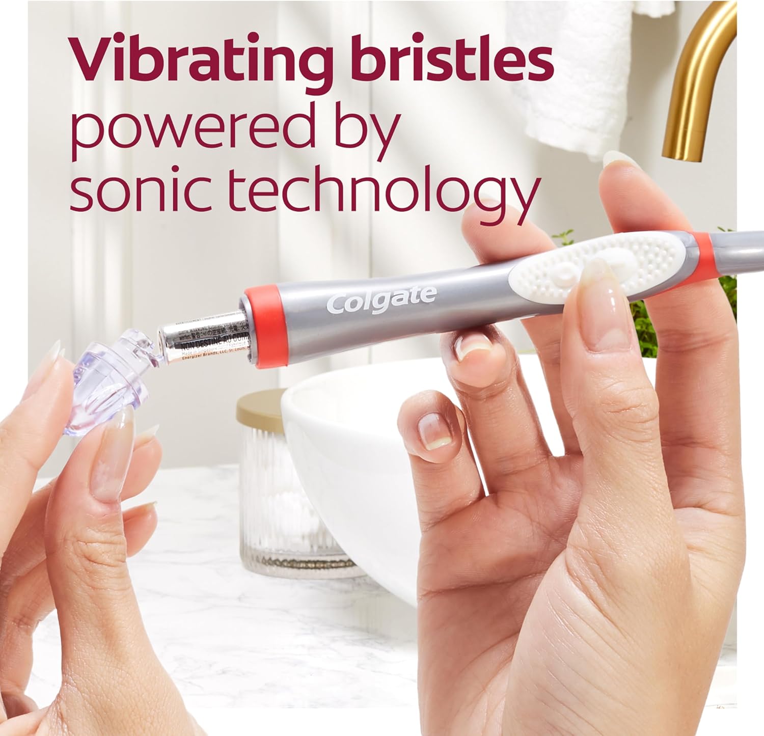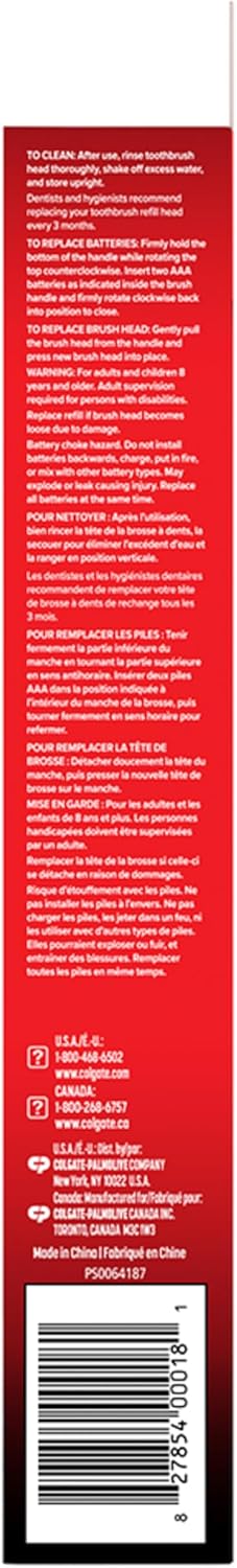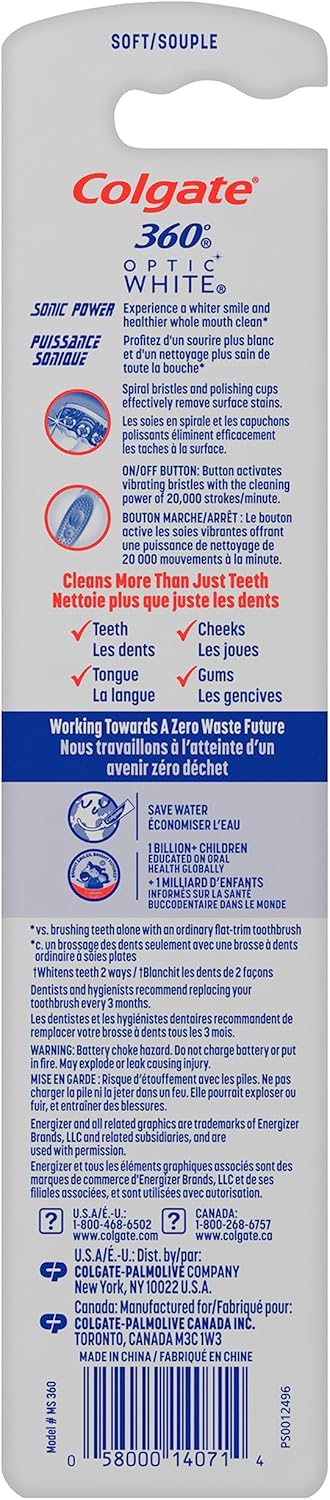 Colgate 360 Vibrate Whitening Battery-Operated Toothbrush combines the power of a battery-operated toothbrush with the familiarity of a manual toothbrush head for a brighter, whiter smile*. This full mouth vibrating toothbrush uses soft Floss Tip bristles** to clean between teeth. The whitening toothbrush is perfect for travel because it’s battery-powered, so it can be used wherever you go (1 AAA battery included). Experience a whiter smile* and a healthier whole mouth clean with just a press of a button with the Colgate 360 battery powered toothbrush. This disposable electric toothbrush cleans the teeth, cheeks, tongue, and gums so you can enjoy a whole mouth clean with every brush. The soft, vibrating toothbrush bristles deliver powerful cleaning using sonic technology. Clean better*** with vibrating bristles powered by sonic technology with the Colgate 360 disposable electric battery whitening toothbrush. *vs. brushing teeth alone with an ordinary flat trim toothbrush **does not replace flossing ***vs. a manual toothbrush