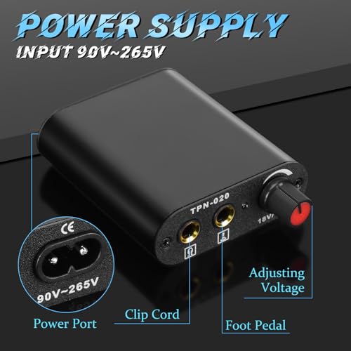 - ¡¼Complete Accessories¡½The set includes foot pedal, clip cord, ink cups, practice skin, and more essential tattoo supplies, making it the ideal all-in-one kit for beginner and tattoo artists.