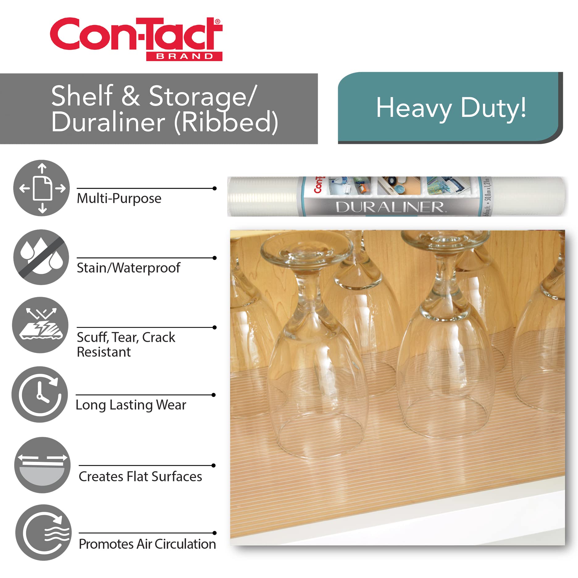 Details: Give your shelves, drawers, or any surface a new lease on life with the Con-Tact Brand Premium Plus shelf liner, a thick, heavy-duty, and durable liner. Made of the highest quality materials, our shelf liner is designed not to cut, fray, or rip in any condition and will protect every surface from everyday wear and tear, dust, dirt, scratches, and spills. With our unique drawer liner, you can keep everything in place, featuring a textured top and a smooth, non-stick, ultra-strong, slip-resistant backing that reduces shifting so your fragile items won't be damaged. Our cabinet liner can be used in several areas of your home, garage, office, fridge, cabinets, and racks. Moreover, the shelf liner allows you to transform wire shelving into a solid surface or keep your utensils and dishware in place in your drawers. Our cabinet liner is easy to install, waterproof, unique, non-adhesive, phthalate- and BPA-free, and easy to clean. Upgrade your shelves and keep them in pristine condition with our Premium Plus shelf liners.