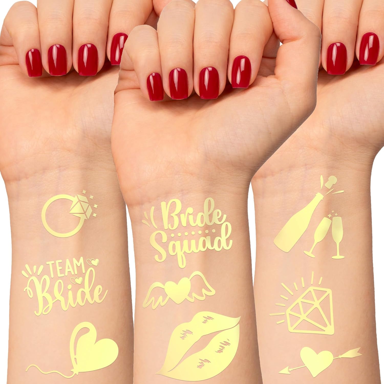 - ✅ SAFE FOR ALL SKIN TYPES -- Our set of temporary Bachelorette tattoos for women is non-toxic and safe to use for all ages. Includes two sheets with a total of 38 premium metallic golden foil tattoos, featuring unique and beautiful designs for the bride and her entire bride tribe squad. MUST HAVE GIFT idea for any bride to be