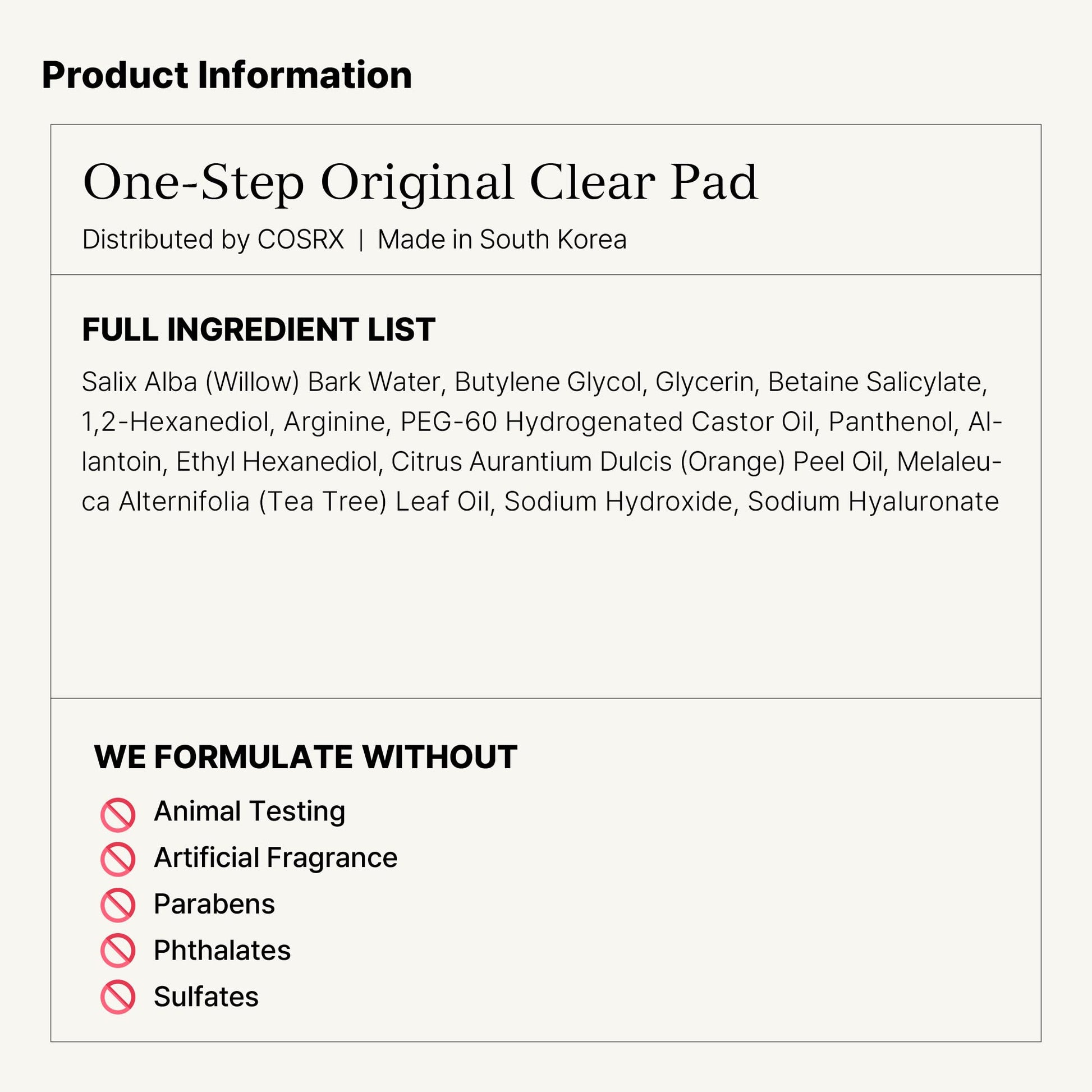 - COSRX Standards: COSRX Standards: All COSRX products are formulated with skin-friendly ingredients that alleviate irritated skin. Hypoallergenic, Dermatologist tested, Animal Testing-FREE, Parabens-FREE, Sulfates-FREE, Phthalates-FREE
