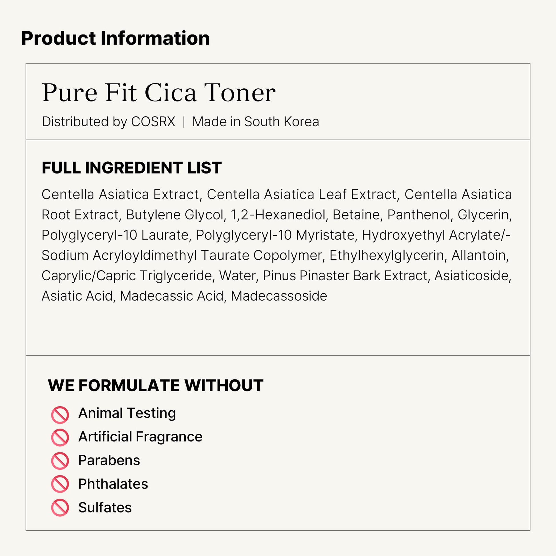 - COSRX Standards: All COSRX products are formulated with skin-friendly ingredients that alleviate irritated skin. Hypoallergenic, Dermatologist tested, Animal Testing-FREE, Parabens-FREE, Sulfates-FREE, Phthalates-FREE