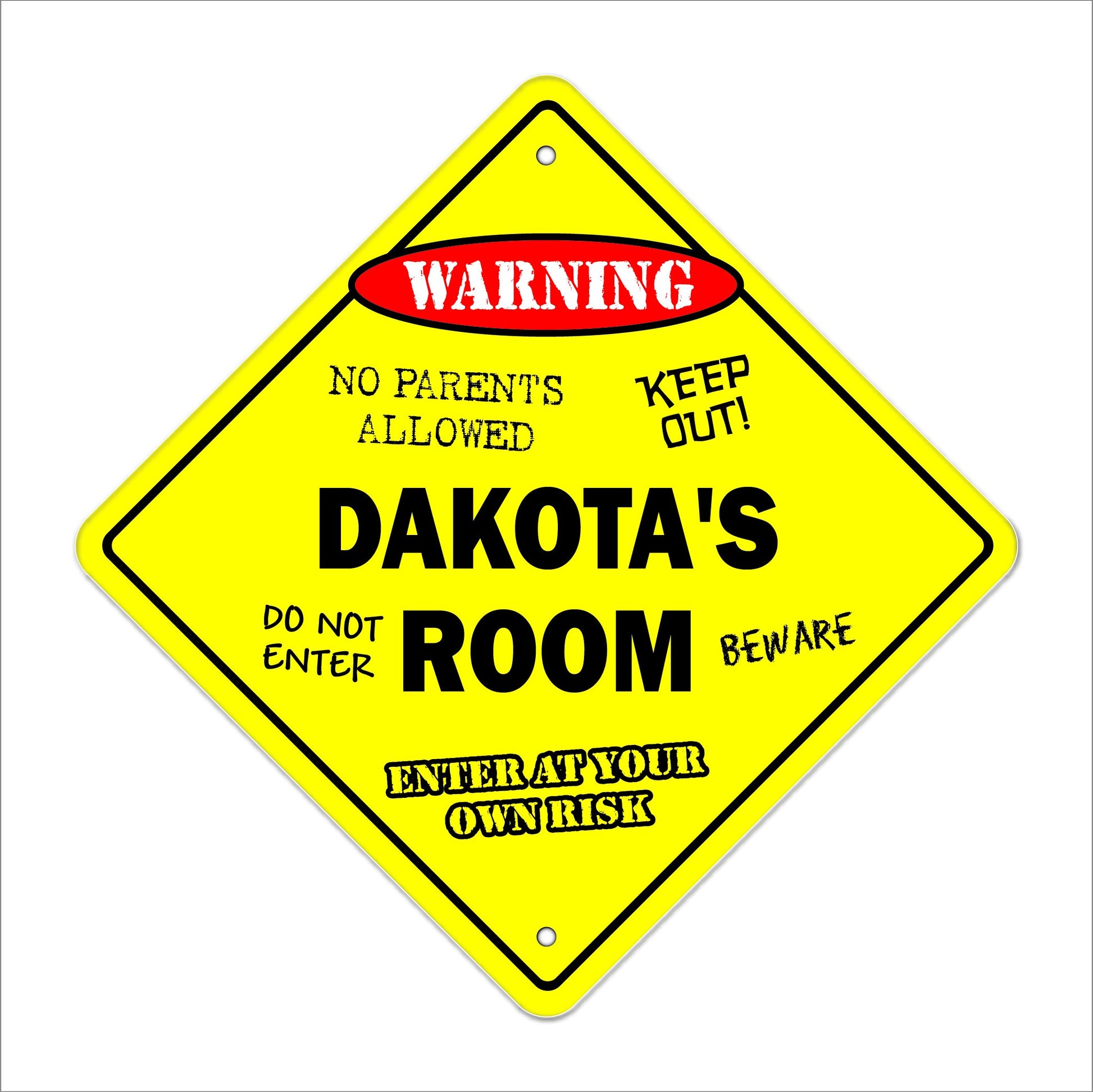 Details: Everybody loves personalized gifts and this is perfect for those kids in your life Made in the USA these signs are sturdy weatherproof plastic 12 tall and 12 wide diamond shaped with rounded corners and 2 cut mounting holes. Made To last Made from a special plastic designed to hold up to a beating, This sign can bend with out breaking and will never chip or crack, the colorful lettering will last a lifetime indoors and up to 4 years in the sun for outdoor use. Safe for A Childs Room Our signs have rounded edges and our made of a very strong but lightweight plastic so you can hang it in your child's room without the worry of it falling and hurting your child or cutting them with sharp edges. Product Details: Dakota's Room SignPre-Cut Mounting Holes Indoor and Outdoor Use Rust and Fade Resistant One - Sided Scratch Resistant treated Ink Dimension: 12 Tall x 12 Wide Made in the USA Outdoor Durable Plastic Click Add to Cart to get your Dakota's Room sign today and enjoy a good laugh each time you pass by!
