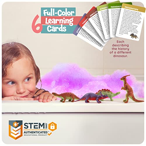 - Convert your tub into a fizzy dino world: Includes 6 uniquely-colored egg-shaped bath fizzies (4.66 oz) each with a different dinosaur buried inside, and 6 beautiful cards, each describing the history of a different dinosaur. After revealing a dino, try to match up the appropriate card to your dinosaur and learn more about it.