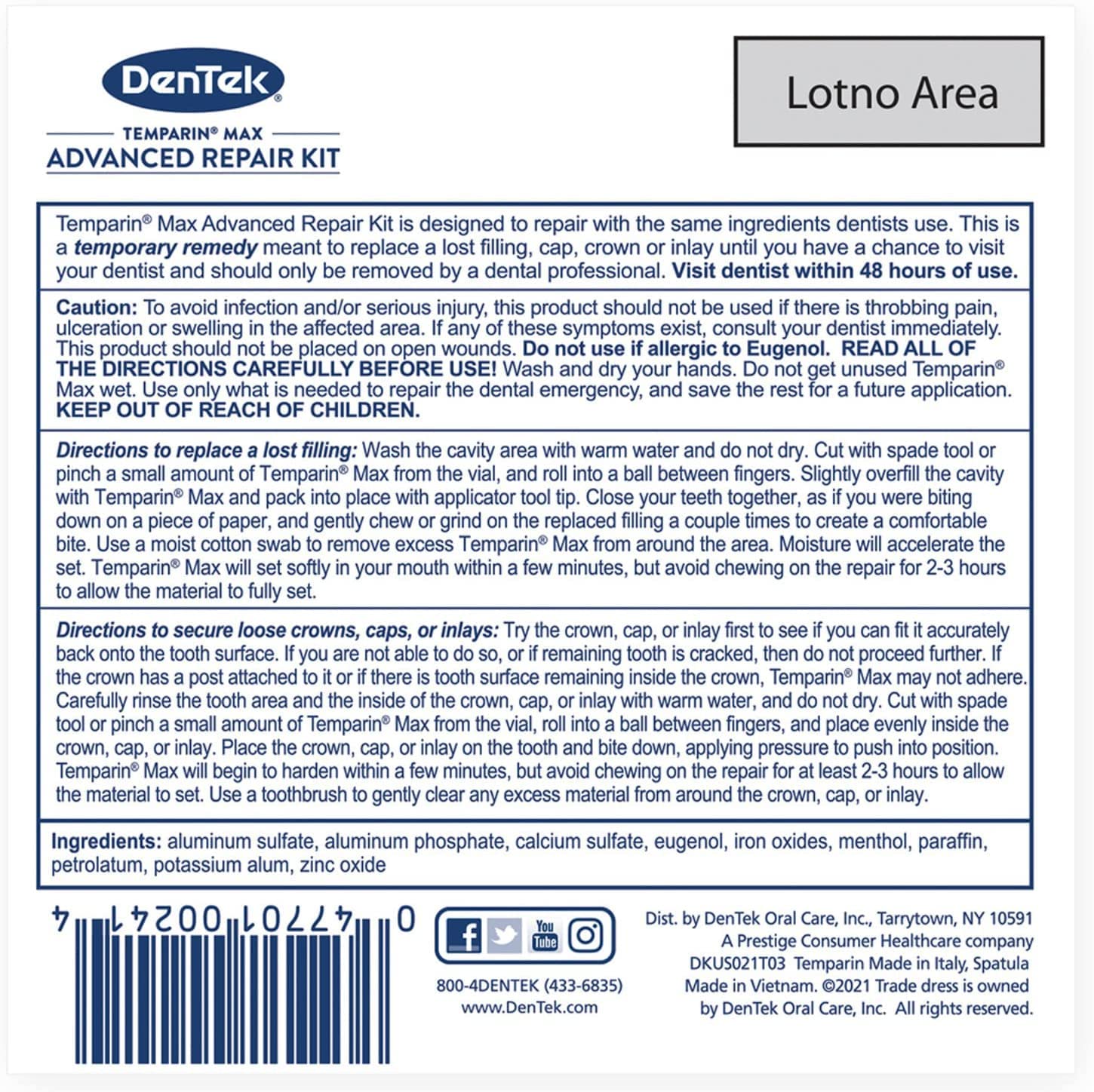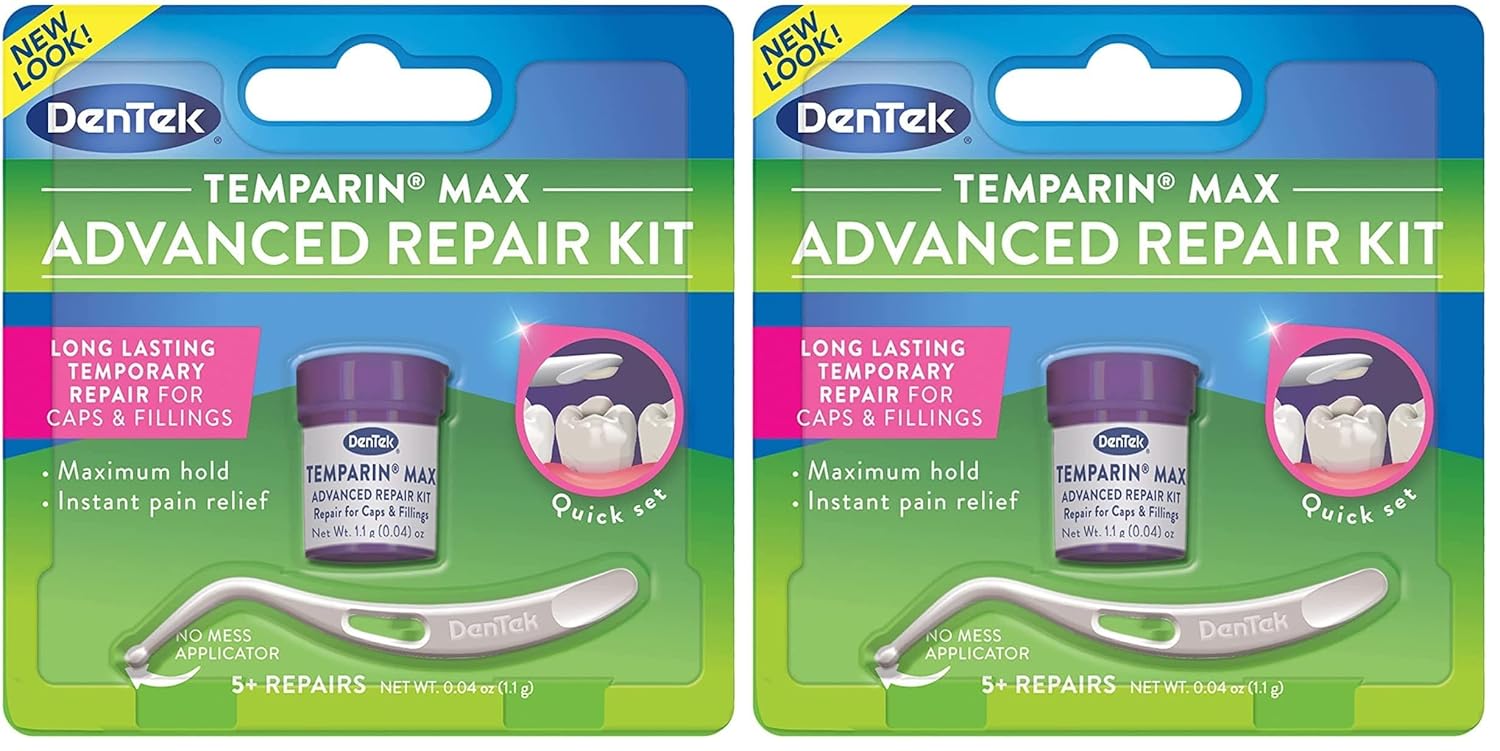 Temparinmax is made of the same ingredients dentists use to repair teeth or to replace a lost filing, cap, crown or inlay. Use the quick-fix remedy dentists use most with Temparin max. Damage To fillings, caps, crowns or inlays need a quick fix to prevent tooth loss and oral pain. Temparin max is a temporary remedy for up to 48 hours of protection before your dental visit. Apply TemparinMax to help secure broken dental work up to 48 hours before getting in to see your dentist. This is an excellent addition to any oral health kit or dental first aid kit. Dental emergency product TemparinMax includes comprehensive, easy-to-follow instructions on how to replace a lost filling and how to secure loose crowns, caps or inlays. Temparin max is a temporary remedy to use before you visit your dentist. Only a dentist can remove Temparin max when it's time to replace the lost filling or the loosened crown, cap or inlay. Please read all directions and cautions before applying TemparinMax. As Soon as you feel broken or loose dental work, call your dentist to make an appointment. Most dentists recommend applying TemparinMax to repair and/or secure dental work temporarily. Do you have fillings, crowns, caps or inlays? add TemparinMax to your oral health pain relief kit or your dental repair kit, and be prepared to take care of your smile during an emergency. Get DenTek TemparinMax for emergency dental first aid bonding solution dentists use most.
