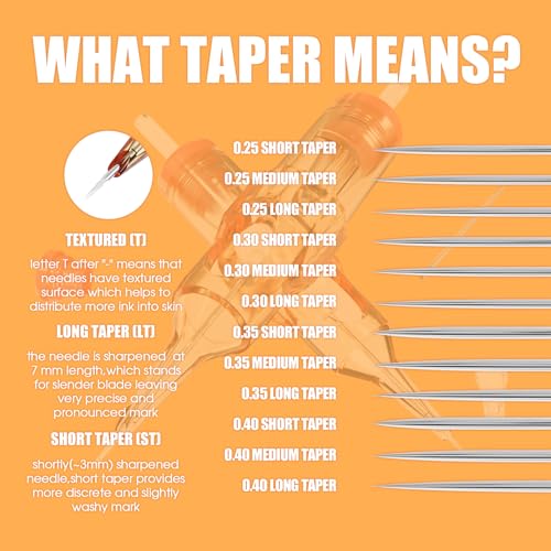 - Smoother Ink Flow and Minimal Trauma: Each pro cartridges needles is meticulously engineered to 100% eliminate side-to-side play, allowing you to concentrate on your work without distraction and hold ink well. With assembly tolerances finer than a fraction of a strand of hair, delivering surefire precise tattooing every time.