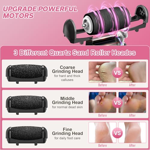 - ???UPGRADED VERSION -- POWERFUL and SAFE: Upgraded version of electric foot file callus remover is equipped with 3 enlarged quartz crystal removable roller head, quartz roller head wider, larger area to remove dead skin, 2 speeds can correspond to the roughness required to remove the callus on the foot; 1900/2200 revolutions / minute, grinding faster and cleaner; thus effectively removing calluses and cracked heel dead skin, , so that your feet to restore delicate and smooth skin